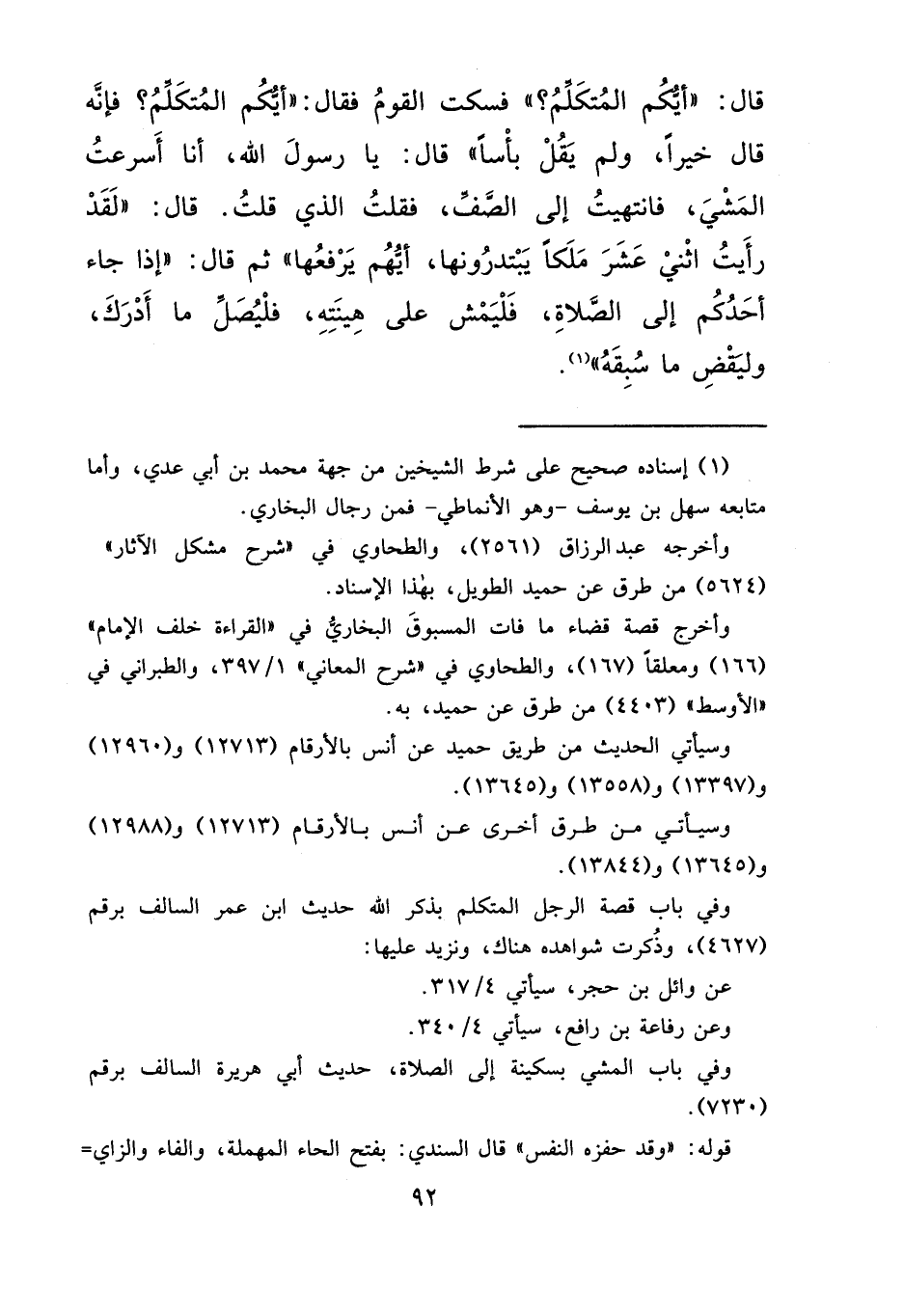 قَالَ: " أَيُّكُمُ الْمُتَكَلِّمُ؟ " فَسَكَتَ الْقَوْمُ، فَقَالَ: " أَيُّكُمُ الْمُتَكَلِّمُ فَإِنَّهُ قَالَ خَيْرًا، وَلَمْ يَقُلْ بَأْسًا " قَالَ: يَا رَسُولَ اللهِ أَنَا أَسْرَعْتُ الْمَشْيَ، فَانْتَهَيْتُ إِلَى الصَّفِّ، فَقُلْتُ الَّذِي قُلْتُ، قَالَ: " لَقَدْ رَأَيْتُ اثْنَيْ عَشَرَ مَلَكًا، يَبْتَدِرُونَهَا أَيُّهُمْ يَرْفَعُهَا " ثُمَّ قَالَ: " إِذَا جَاءَ أَحَدُكُمْ إِلَى الصَّلَاةِ، فَلْيَمْشِ عَلَى هِينَتِهِ، فَلْيُصَلِّ مَا أَدْرَكَ، وَلْيَقْضِ مَا سُبِقَهُ " (١)