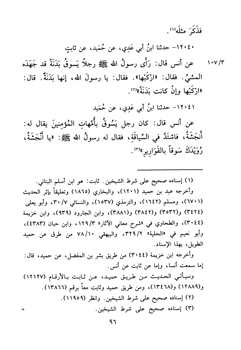 ١٢٠٤١ - حَدَّثَنَا ابْنُ أَبِي عَدِيٍّ، عَنْ حُمَيْدٍ، عَنْ أَنَسٍ قَالَ: كَانَ رَجُلٌ يَسُوقُ بِأُمَّهَاتِ الْمُؤْمِنِينَ يُقَالُ لَهُ: أَنْجَشَةُ، فَاشْتَدَّ فِي السِّيَاقَةِ، فَقَالَ لَهُ رَسُولُ اللهِ صَلَّى اللهُ عَلَيْهِ وَسَلَّمَ: " يَا أَنْجَشَةُ، رُوَيْدَكَ سَوْقًا بِالْقَوَارِيرِ " (٣)