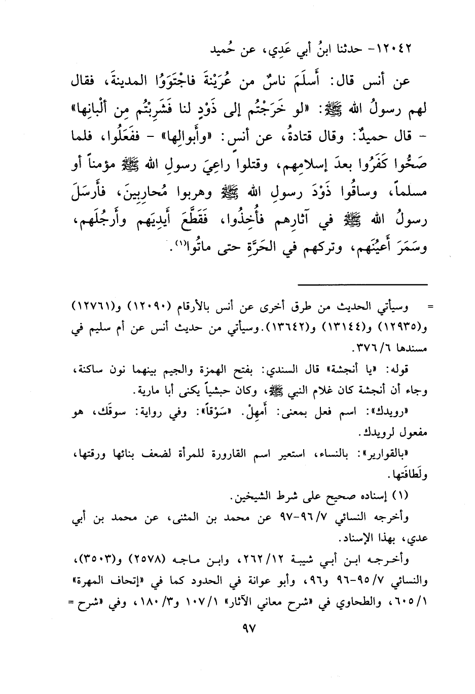 ١٢٠٤٢ - حَدَّثَنَا ابْنُ أَبِي عَدِيٍّ، عَنْ حُمَيْدٍ، عَنْ أَنَسٍ قَالَ: أَسْلَمَ نَاسٌ مِنْ عُرَيْنَةَ فَاجْتَوَوْا الْمَدِينَةَ، فَقَالَ لَهُمْ رَسُولُ اللهِ صَلَّى اللهُ عَلَيْهِ وَسَلَّمَ: " لَوْ خَرَجْتُمْ إِلَى ذَوْدٍ لَنَا فَشَرِبْتُمْ مِنْ أَلْبَانِهَا " - قَالَ حُمَيْدٌ: وَقَالَ قَتَادَةُ: عَنْ أَنَسٍ " وَأَبْوَالِهَا " - فَفَعَلُوا. فَلَمَّا صَحُّوا كَفَرُوا بَعْدَ إِسْلَامِهِمْ، وَقَتَلُوا رَاعِيَ رَسُولِ اللهِ صَلَّى اللهُ عَلَيْهِ وَسَلَّمَ مُؤْمِنًا أَوْ مُسْلِمًا، وَسَاقُوا ذَوْدَ رَسُولِ اللهِ صَلَّى اللهُ عَلَيْهِ وَسَلَّمَ، وَهَرَبُوا مُحَارِبِينَ. فَأَرْسَلَ رَسُولُ اللهِ صَلَّى اللهُ عَلَيْهِ وَسَلَّمَ فِي آثَارِهِمْ، فَأُخِذُوا فَقَطَّعَ أَيْدِيَهُمْ، وَأَرْجُلَهُمْ، وَسَمَرَ أَعْيُنَهُمْ، وَتَرَكَهُمْ فِي الْحَرَّةِ حَتَّى مَاتُوا (١)
