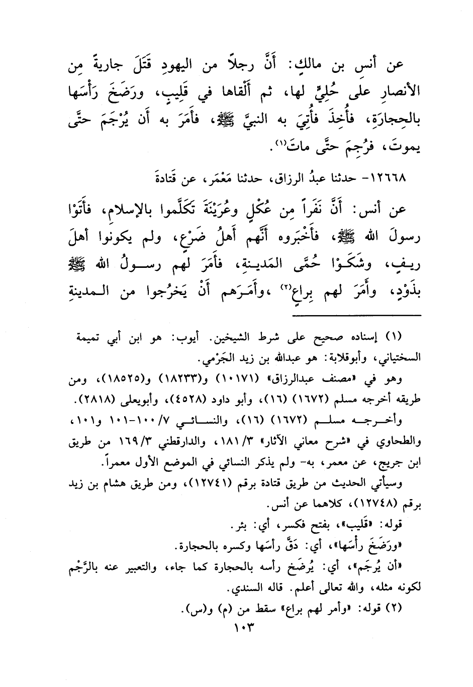 ١٢٦٦٨ - حَدَّثَنَا عَبْدُ الرَّزَّاقِ، حَدَّثَنَا مَعْمَرٌ، عَنْ قَتَادَةَ، عَنْ أَنَسٍ، أَنَّ نَفَرًا مِنْ عُكْلٍ وَعُرَيْنَةَ تَكَلَّمُوا بِالْإِسْلَامِ، فَأَتَوْا رَسُولَ اللهِ صَلَّى اللهُ عَلَيْهِ وَسَلَّمَ، فَأَخْبَرُوهُ أَنَّهُمْ أَهْلُ ضَرْعٍ، وَلَمْ يَكُونُوا أَهْلَ رِيفٍ، وَشَكَوْا حُمَّى الْمَدِينَةِ، فَأَمَرَ لَهُمْ رَسُولُ اللهِ صَلَّى اللهُ عَلَيْهِ وَسَلَّمَ بِذَوْدٍ، وَأَمَرَ لَهُمْ بِرَاعٍ (٢) وَأَمَرَهُمْ أَنْ يَخْرُجُوا مِنَ الْمَدِينَةِ،
