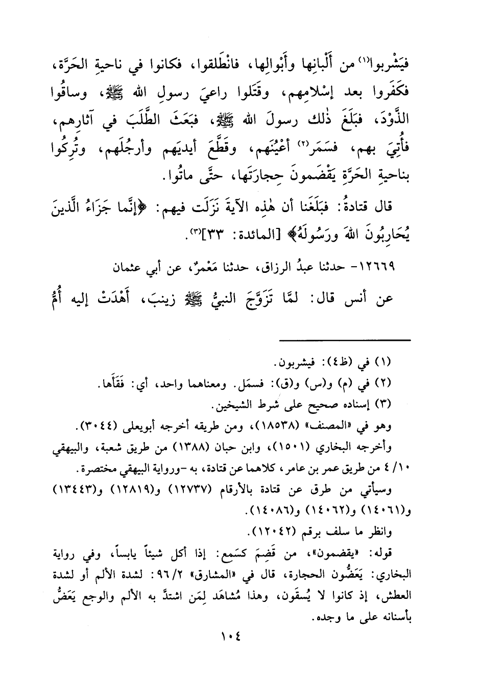 فَيَشْرَبُوا (١) مِنْ أَلْبَانِهَا، وَأَبْوَالِهَا، فَانْطَلَقُوا، فَكَانُوا فِي نَاحِيَةِ الْحَرَّةِ، فَكَفَرُوا بَعْدَ إِسْلَامِهِمْ، وَقَتَلُوا رَاعِيَ رَسُولِ اللهِ صَلَّى اللهُ عَلَيْهِ وَسَلَّمَ، وَسَاقُوا الذَّوْدَ. فَبَلَغَ ذَلِكَ رَسُولَ اللهِ صَلَّى اللهُ عَلَيْهِ وَسَلَّمَ، فَبَعَثَ الطَّلَبَ فِي آثَارِهِمْ، فَأُتِيَ بِهِمْ، فَسَمَرَ (٢) أَعْيُنَهُمْ، وَقَطَّعَ أَيْدِيَهُمْ وَأَرْجُلَهُمْ، وَتُرِكُوا بِنَاحِيَةِ الْحَرَّةِ يَقْضَمُونَ حِجَارَتَهَا حَتَّى مَاتُوا، قَالَ قَتَادَةُ: " فَبَلَغَنَا أَنَّ هَذِهِ الْآيَةَ نَزَلَتْ فِيهِمْ ": {إِنَّمَا جَزَاءُ الَّذِينَ يُحَارِبُونَ اللهَ وَرَسُولَهُ} [المائدة: ٣٣] (٣)