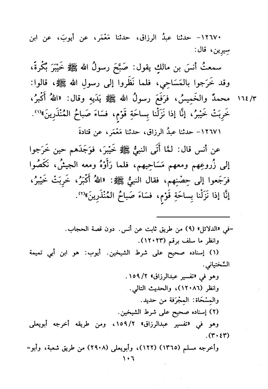 ١٢٦٧١ - حَدَّثَنَا عَبْدُ الرَّزَّاقِ، حَدَّثَنَا مَعْمَرٌ، عَنْ قَتَادَةَ، عَنْ أَنَسٍ قَالَ: لَمَّا أَتَى النَّبِيُّ صَلَّى اللهُ عَلَيْهِ وَسَلَّمَ خَيْبَرَ، فَوَجَدَهُمْ حِينَ خَرَجُوا إِلَى زُرُوعِهِمْ وَمَعَهُمْ مَسَاحِيهِمْ، فَلَمَّا رَأَوْهُ وَمَعَهُ الْجَيْشُ نَكَصُوا فَرَجَعُوا إِلَى حِصْنِهِمْ، فَقَالَ النَّبِيُّ صَلَّى اللهُ عَلَيْهِ وَسَلَّمَ: " اللهُ أَكْبَرُ، خَرِبَتْ خَيْبَرُ، إِنَّا إِذَا نَزَلْنَا بِسَاحَةِ قَوْمٍ، فَسَاءَ صَبَاحُ الْمُنْذَرِينَ " (٢)
