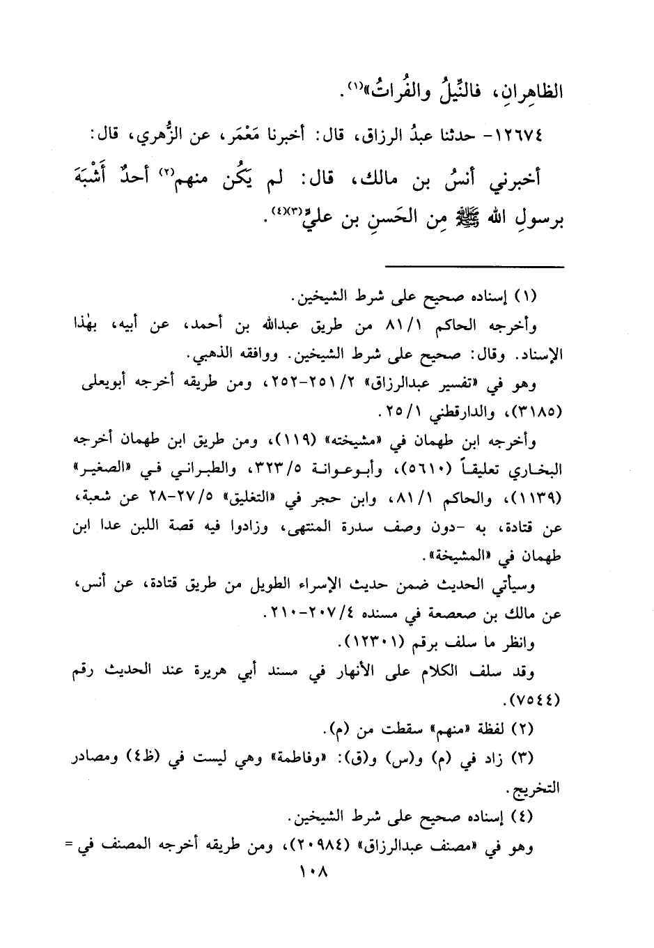 ١٢٦٧٤ - حَدَّثَنَا عَبْدُ الرَّزَّاقِ، قَالَ: أَخْبَرَنَا مَعْمَرٌ، عَنِ الزُّهْرِيِّ، قَالَ: أَخْبَرَنِي أَنَسُ بْنُ مَالِكٍ قَالَ: " لَمْ يَكُنْ مِنْهُمْ (٢) أَحَدٌ أَشْبَهَ بِرَسُولِ اللهِ صَلَّى اللهُ عَلَيْهِ وَسَلَّمَ مِنَ الْحَسَنِ بْنِ عَلِيٍّ (٣) " (٤)