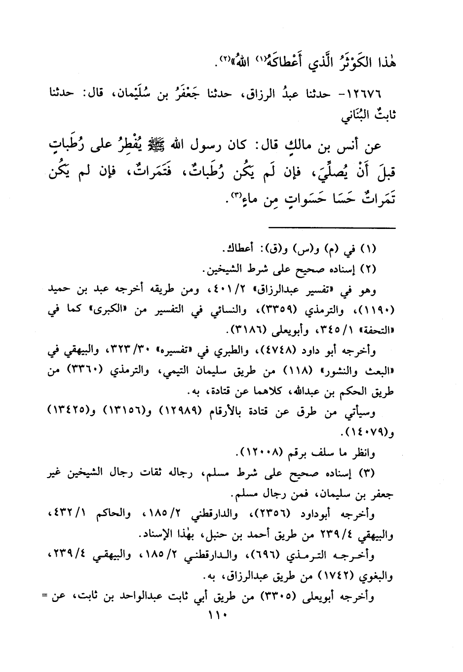 ١٢٦٧٦ - حَدَّثَنَا عَبْدُ الرَّزَّاقِ، حَدَّثَنَا جَعْفَرُ بْنُ سُلَيْمَانَ، قَالَ: حَدَّثَنَا ثَابِتٌ الْبُنَانِيُّ، عَنْ أَنَسِ بْنِ مَالِكٍ قَالَ: " كَانَ رَسُولُ اللهِ صَلَّى اللهُ عَلَيْهِ وَسَلَّمَ يُفْطِرُ عَلَى رُطَبَاتٍ قَبْلَ أَنْ يُصَلِّيَ، فَإِنْ لَمْ يَكُنْ رُطَبَاتٌ، فَتَمَرَاتٌ، فَإِنْ لَمْ يَكُنْ تَمَرَاتٌ حَسَا حَسَوَاتٍ مِنْ مَاءٍ " (٣)