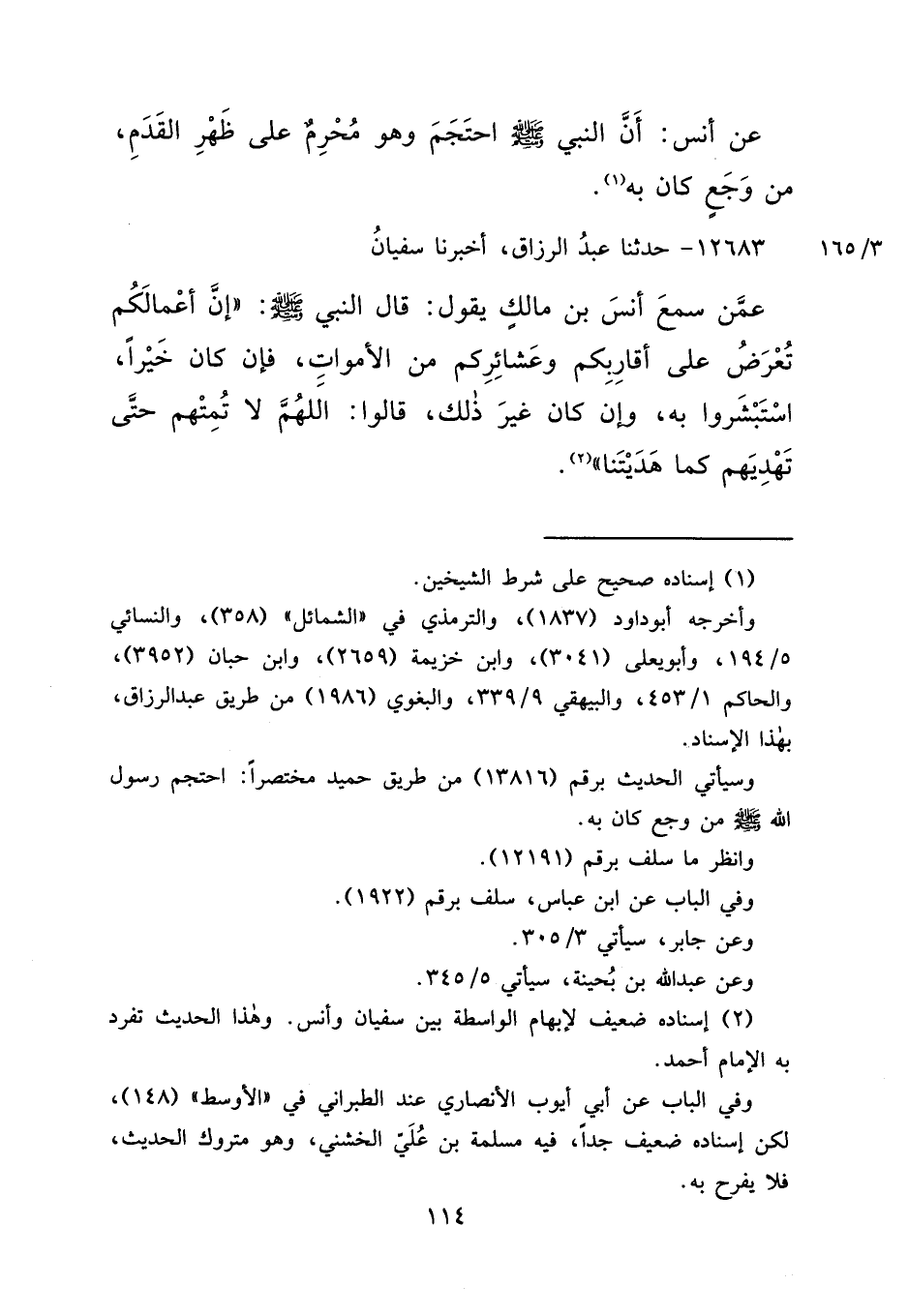 عَنْ أَنَسٍ، " أَنَّ النَّبِيَّ صَلَّى اللهُ عَلَيْهِ وَسَلَّمَ احْتَجَمَ وَهُوَ مُحْرِمٌ عَلَى ظَهْرِ الْقَدَمِ مِنْ وَجَعٍ كَانَ بِهِ " (١)