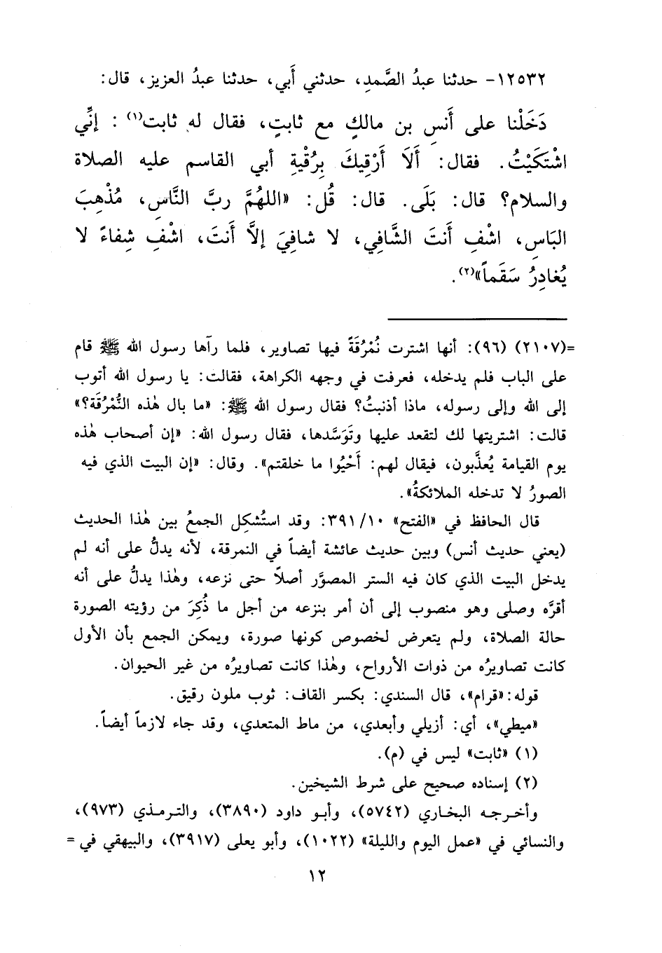 ١٢٥٣٢ - حَدَّثَنَا عَبْدُ الصَّمَدِ، حَدَّثَنِي أَبِي، حَدَّثَنَا عَبْدُ الْعَزِيزِ قَالَ: دَخَلْنَا عَلَى أَنَسِ بْنِ مَالِكٍ مَعَ ثَابِتٍ فَقَالَ لَهُ ثَابِتٌ: (١) إِنِّي اشْتَكَيْتُ، فَقَالَ: أَلَا أَرْقِيكَ بِرُقْيَةِ أَبِي الْقَاسِمِ عَلَيْهِ الصَّلَاةُ وَالسَّلَامُ؟ قَالَ: بَلَى، قَالَ: " قُلِ اللهُمَّ رَبَّ النَّاسِ، مُذْهِبَ الْبَأْسِ، اشْفِ أَنْتَ الشَّافِي لَا شَافِيَ إِلَّا أَنْتَ، اشْفِ شِفَاءً لَا يُغَادِرُ سَقَمًا " (٢)