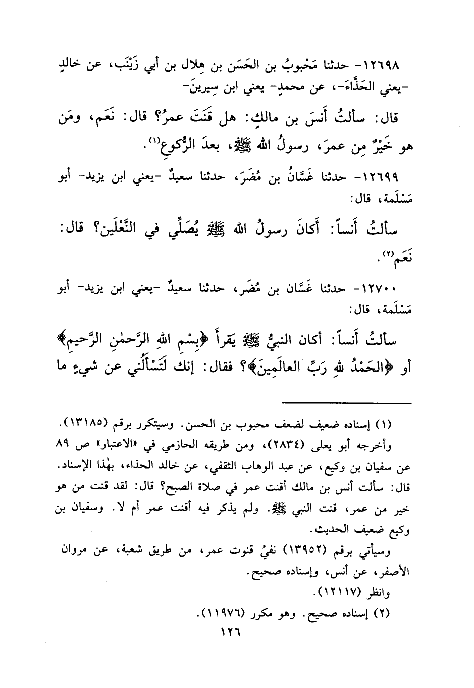 ١٢٦٩٨ - حَدَّثَنَا مَحْبُوبُ بْنُ الْحَسَنِ بْنِ هِلَالِ بْنِ أَبِي زَيْنَبَ، عَنْ خَالِدٍ يَعْنِي الْحَذَّاءَ، عَنْ مُحَمَّدٍ يَعْنِي ابْنَ سِيرِينَ، قَالَ: سَأَلْتُ أَنَسَ بْنَ مَالِكٍ، هَلْ قَنَتَ عُمَرُ؟ قَالَ: " نَعَمْ، وَمَنْ هُوَ خَيْرٌ مِنْ عُمَرَ، رَسُولُ اللهِ صَلَّى اللهُ عَلَيْهِ وَسَلَّمَ، بَعْدَ الرُّكُوعِ " (١)
