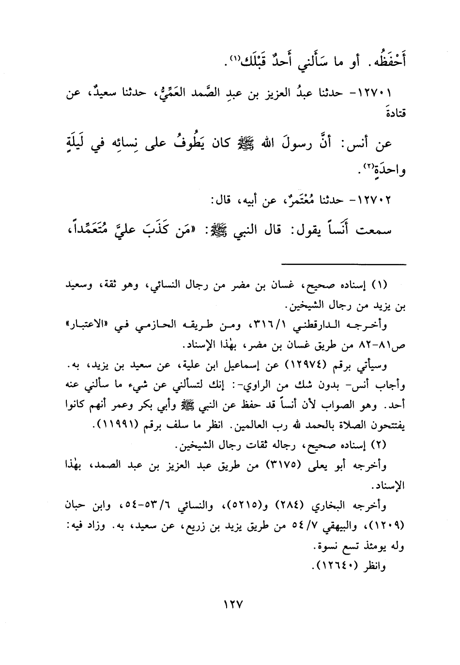 ١٢٧٠١ - حَدَّثَنَا عَبْدُ الْعَزِيزِ بْنُ عَبْدِ الصَّمَدِ الْعَمِّيُّ، حَدَّثَنَا سَعِيدٌ، عَنْ قَتَادَةَ، عَنْ أَنَسٍ، " أَنَّ رَسُولَ اللهِ صَلَّى اللهُ عَلَيْهِ وَسَلَّمَ كَانَ يَطُوفُ عَلَى نِسَائِهِ فِي لَيْلَةٍ وَاحِدَةٍ " (٢)