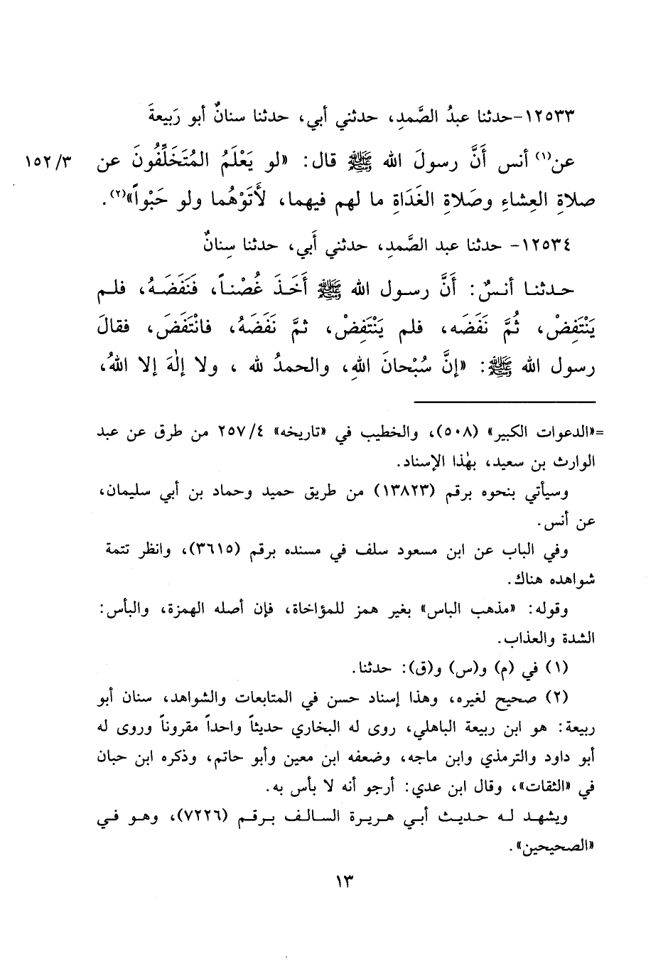 ١٢٥٣٣ - حَدَّثَنَا عَبْدُ الصَّمَدِ، حَدَّثَنِي أَبِي، حَدَّثَنَا سِنَانٌ أَبُو رَبِيعَةَ، عَنْ (١) أَنَسٍ، أَنَّ رَسُولَ اللهِ صَلَّى اللهُ عَلَيْهِ وَسَلَّمَ قَالَ: " لَوْ يَعْلَمُ الْمُتَخَلِّفُونَ عَنْ صَلَاةِ الْعِشَاءِ وَصَلَاةِ الْغَدَاةِ مَا لَهُمْ فِيهِمَا، لَأَتَوْهُمَا وَلَوْ حَبْوًا " (٢)