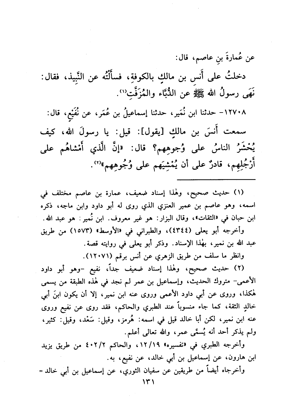 ١٢٧٠٨ - حَدَّثَنَا ابْنُ نُمَيْرٍ، حَدَّثَنَا إِسْمَاعِيلُ بْنُ عُمَرَ، عَنْ نُفَيْعٍ قَالَ: سَمِعْتُ أَنَسَ بْنَ مَالِكٍ، يَقُولُ: قِيلَ: يَا رَسُولَ اللهِ، كَيْفَ يُحْشَرُ النَّاسُ عَلَى وُجُوهِهِمْ؟ قَالَ: " إِنَّ الَّذِي أَمْشَاهُمْ عَلَى أَرْجُلِهِمْ، قَادِرٌ عَلَى أَنْ يُمْشِيَهُمْ عَلَى وُجُوهِهِمْ " (٢)