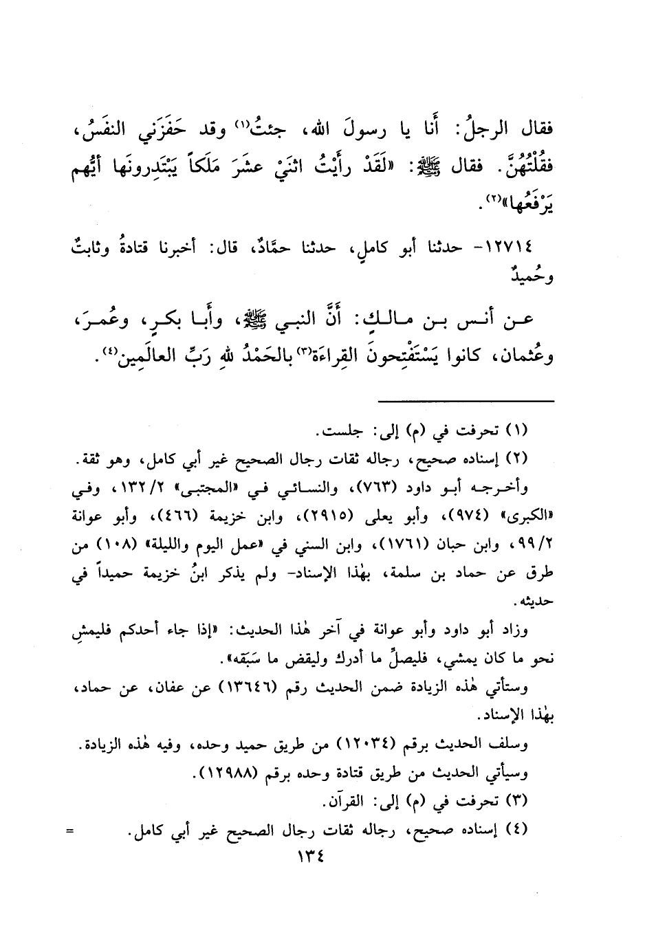 ١٢٧١٤ - حَدَّثَنَا أَبُو كَامِلٍ، حَدَّثَنَا حَمَّادٌ، قَالَ: أَخْبَرَنَا قَتَادَةُ، وَثَابِتٌ، وَحُمَيْدٌ، عَنْ أَنَسِ بْنِ مَالِكٍ، " أَنَّ النَّبِيَّ صَلَّى اللهُ عَلَيْهِ وَسَلَّمَ، وَأَبَا بَكْرٍ، وَعُمَرَ، وَعُثْمَانَ كَانُوا يَسْتَفْتِحُونَ الْقِرَاءَةَ (٣) بِالْحَمْدِ لِلَّهِ رَبِّ الْعَالَمِينَ " (٤)