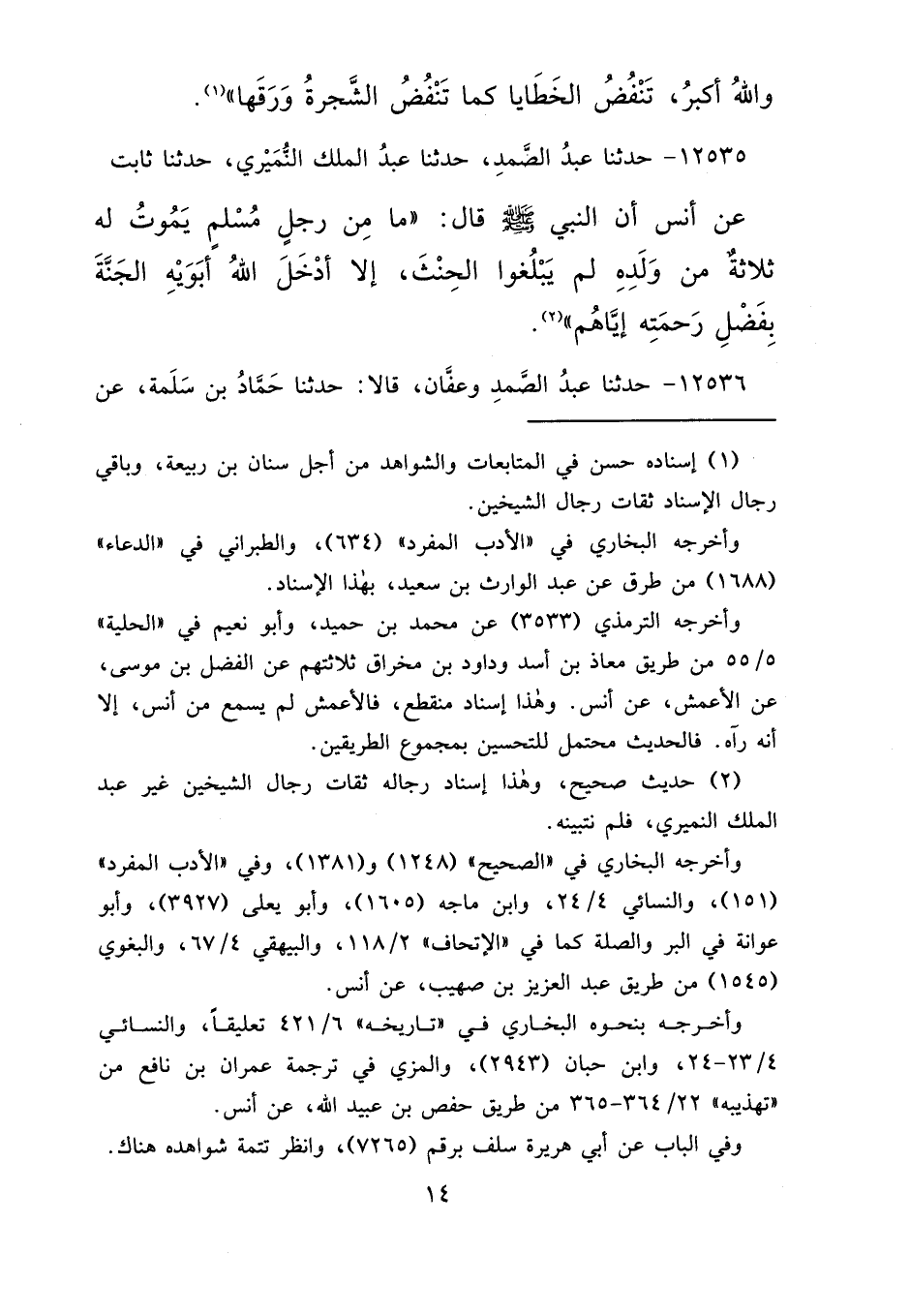 ١٢٥٣٥ - حَدَّثَنَا عَبْدُ الصَّمَدِ، حَدَّثَنَا عَبْدُ الْمَلِكِ النُّمَيْرِيُّ، حَدَّثَنَا ثَابِتٌ، عَنْ أَنَسٍ، أَنَّ النَّبِيَّ صَلَّى اللهُ عَلَيْهِ وَسَلَّمَ قَالَ: " مَا مِنْ رَجُلٍ مُسْلِمٍ يَمُوتُ لَهُ ثَلَاثَةٌ مِنْ وَلَدِهِ لَمْ يَبْلُغُوا الْحِنْثَ، إِلَّا أَدْخَلَ اللهُ أَبَوَيْهِ الْجَنَّةَ بِفَضْلِ رَحْمَتِهِ إِيَّاهُمْ " (٢)