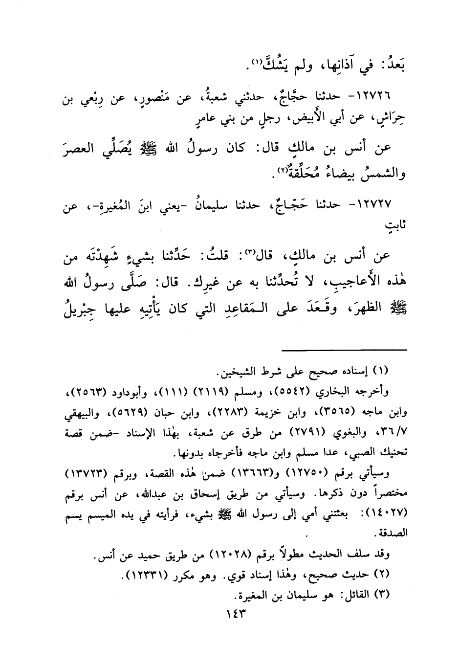 ١٢٧٢٦ - حَدَّثَنَا حَجَّاجٌ، حَدَّثَنِي شُعْبَةُ، عَنْ مَنْصُورٍ، عَنْ رِبْعِيِّ بْنِ حِرَاشٍ، عَنْ أَبِي الْأَبْيَضِ، رَجُلٍ مِنْ بَنِي عَامِرٍ، عَنْ أَنَسِ بْنِ مَالِكٍ قَالَ: " كَانَ رَسُولُ اللهِ صَلَّى اللهُ عَلَيْهِ وَسَلَّمَ يُصَلِّي الْعَصْرَ وَالشَّمْسُ بَيْضَاءُ مُحَلِّقَةٌ " (٢)