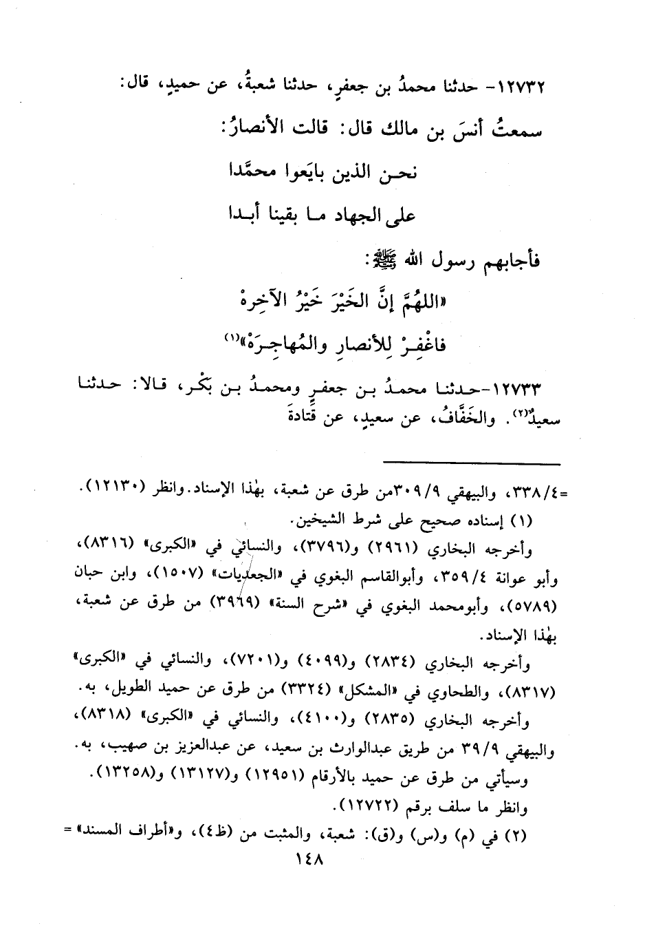 ١٢٧٣٢ - حَدَّثَنَا مُحَمَّدُ بْنُ جَعْفَرٍ، حَدَّثَنَا شُعْبَةُ، عَنْ حُمَيْدٍ قَالَ: سَمِعْتُ أَنَسَ بْنَ مَالِكٍ قَالَ: قَالَتِ الْأَنْصَارُ: نَحْنُ الَّذِينَ بَايَعُوا مُحَمَّدَا عَلَى الْجِهَادِ مَا بَقِينَا أَبَدَا فَأَجَابَهُمْ رَسُولُ اللهِ صَلَّى اللهُ عَلَيْهِ وَسَلَّمَ: " اللهُمَّ إِنَّ الْخَيْرَ خَيْرُ الْآخِرَهْ، فَاغْفِرْ لِلْأَنْصَارِ وَالْمُهَاجِرَهْ " (١)