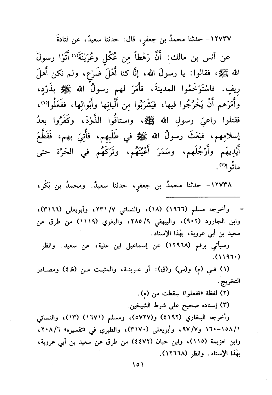١٢٧٣٧ - حَدَّثَنَا مُحَمَّدُ بْنُ جَعْفَرٍ، قَالَ: حَدَّثَنَا سَعِيدٌ، عَنْ قَتَادَةَ، عَنْ أَنَسِ بْنِ مَالِكٍ، أَنَّ رَهْطًا، مِنْ عُكْلٍ وعُرَيْنَةَ (١) أَتَوْا رَسُولَ اللهِ صَلَّى اللهُ عَلَيْهِ وَسَلَّمَ، فَقَالُوا: يَا رَسُولَ اللهِ، إِنَّا كُنَّا أَهْلَ ضَرْعٍ، وَلَمْ نَكُنْ أَهْلَ رِيفٍ، فَاسْتَوْخَمُوا الْمَدِينَةَ، " فَأَمَرَ لَهُمْ رَسُولُ اللهِ صَلَّى اللهُ عَلَيْهِ وَسَلَّمَ بِذَوْدٍ، وَأَمَرَهُمْ أَنْ يَخْرُجُوا فِيهَا، فَيَشْرَبُوا مِنْ أَلْبَانِهَا وَأَبْوَالِهَا "، ففعَلُوا (٢) فَقَتَلُوا رَاعِيَ رَسُولِ اللهِ صَلَّى اللهُ عَلَيْهِ وَسَلَّمَ، وَاسْتَاقُوا الذَّوْدَ، وَكَفَرُوا بَعْدَ إِسْلَامِهِمْ، " فَبَعَثَ رَسُولُ اللهِ صَلَّى اللهُ عَلَيْهِ وَسَلَّمَ فِي طَلَبِهِمْ، فَأُتِيَ بِهِمْ، فَقَطَّعَ أَيْدِيَهُمْ وَأَرْجُلَهُمْ، وَسَمَرَ أَعْيُنَهُمْ، وَتَرَكَهُمْ فِي الْحَرَّةِ حَتَّى مَاتُوا " (٣)