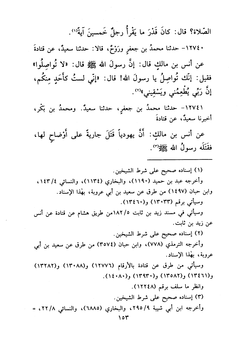 ١٢٧٤٠ - حَدَّثَنَا مُحَمَّدُ بْنُ جَعْفَرٍ، وَرَوْحٌ، قَالَا: حَدَّثَنَا سَعِيدٌ، عَنْ قَتَادَةَ، عَنْ أَنَسِ بْنِ مَالِكٍ قَالَ: إِنَّ رَسُولَ اللهِ صَلَّى اللهُ عَلَيْهِ وَسَلَّمَ قَالَ: " لَا تُوَاصِلُوا ". فَقِيلَ: إِنَّكَ تُوَاصِلُ يَا رَسُولَ اللهِ قَالَ: " إِنِّي لَسْتُ كَأَحَدٍ مِنْكُمْ، إِنَّ رَبِّي يُطْعِمُنِي وَيَسْقِينِي " (٢)