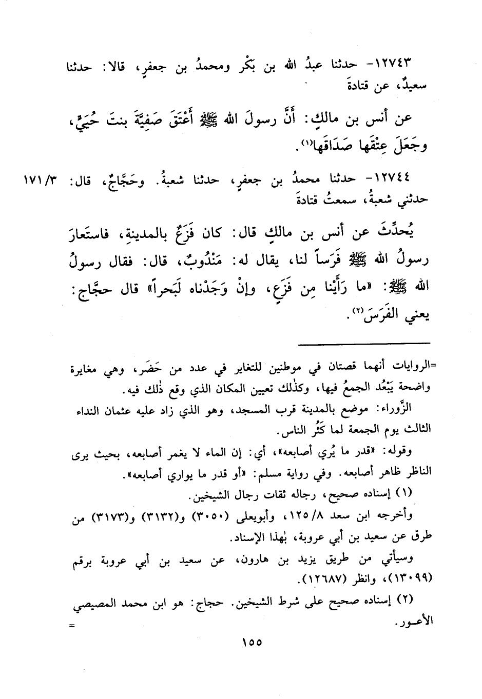 ١٢٧٤٣ - حَدَّثَنَا عَبْدُ اللهِ بْنُ بَكْرٍ، وَمُحَمَّدُ بْنُ جَعْفَرٍ، قَالَا: حَدَّثَنَا سَعِيدٌ، عَنْ قَتَادَةَ، عَنْ أَنَسِ بْنِ مَالِكٍ، " أَنَّ رَسُولَ اللهِ صَلَّى اللهُ عَلَيْهِ وَسَلَّمَ أَعْتَقَ صَفِيَّةَ بِنْتَ حُيَيٍّ، وَجَعَلَ عِتْقَهَا صَدَاقَهَا " (١)