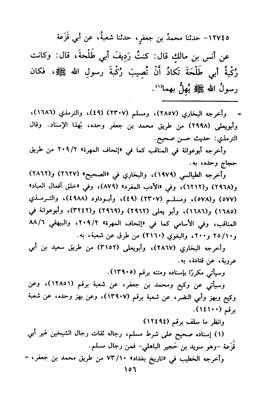 ١٢٧٤٥ - حَدَّثَنَا مُحَمَّدُ بْنُ جَعْفَرٍ، حَدَّثَنَا شُعْبَةُ، عَنْ أَبِي قَزَعَةَ، عَنْ أَنَسِ بْنِ مَالِكٍ قَالَ: كُنْتُ رَدِيفَ أَبِي طَلْحَةَ، قَالَ: " وَكَانَتْ رُكْبَةُ أَبِي طَلْحَةَ تَكَادُ أَنْ تُصِيبَ رُكْبَةَ رَسُولِ اللهِ صَلَّى اللهُ عَلَيْهِ وَسَلَّمَ، فَكَانَ رَسُولُ اللهِ صَلَّى اللهُ عَلَيْهِ وَسَلَّمَ يُهِلُّ بِهِمَا " (١)