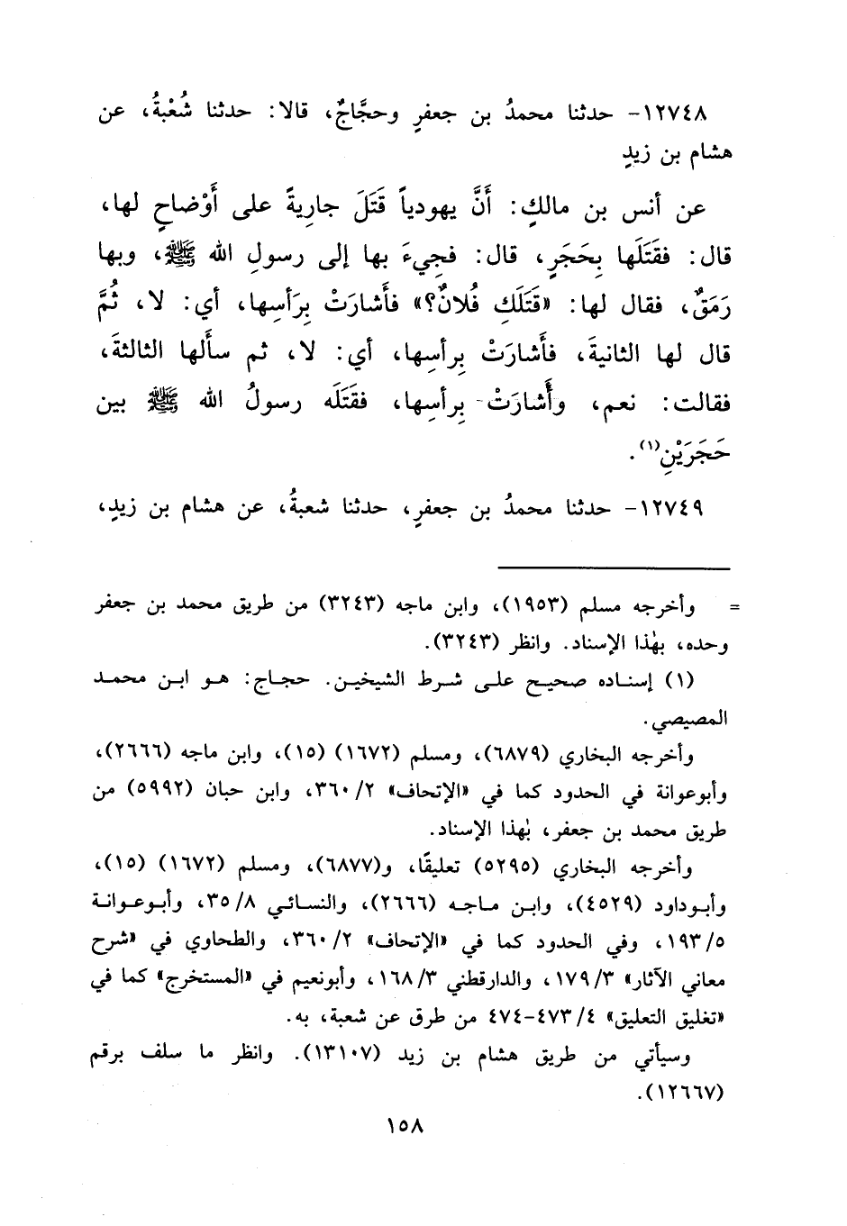 ١٢٧٤٨ - حَدَّثَنَا مُحَمَّدُ بْنُ جَعْفَرٍ، وَحَجَّاجٌ، قَالَا: حَدَّثَنَا شُعْبَةُ، عَنْ هِشَامِ بْنِ زَيْدٍ، عَنْ أَنَسِ بْنِ مَالِكٍ، أَنَّ يَهُودِيًّا قَتَلَ جَارِيَةً عَلَى أَوْضَاحٍ لَهَا، قَالَ: فَقَتَلَهَا بِحَجَرٍ، قَالَ: فَجِيءَ بِهَا إِلَى رَسُولِ اللهِ صَلَّى اللهُ عَلَيْهِ وَسَلَّمَ، وَبِهَا رَمَقٌ، فَقَالَ لَهَا: " قَتَلَكِ فُلَانٌ؟ "، فَأَشَارَتْ بِرَأْسِهَا: أَيْ لَا، ثُمَّ قَالَ لَهَا الثَّانِيَةَ، فَأَشَارَتْ بِرَأْسِهَا: أَيْ لَا، ثُمَّ سَأَلَهَا الثَّالِثَةَ، فَقَالَتْ: نَعَمْ، وَأَشَارَتْ بِرَأْسِهَا، فَقَتَلَهُ رَسُولُ اللهِ صَلَّى اللهُ عَلَيْهِ وَسَلَّمَ، بَيْنَ حَجَرَيْنِ (١)