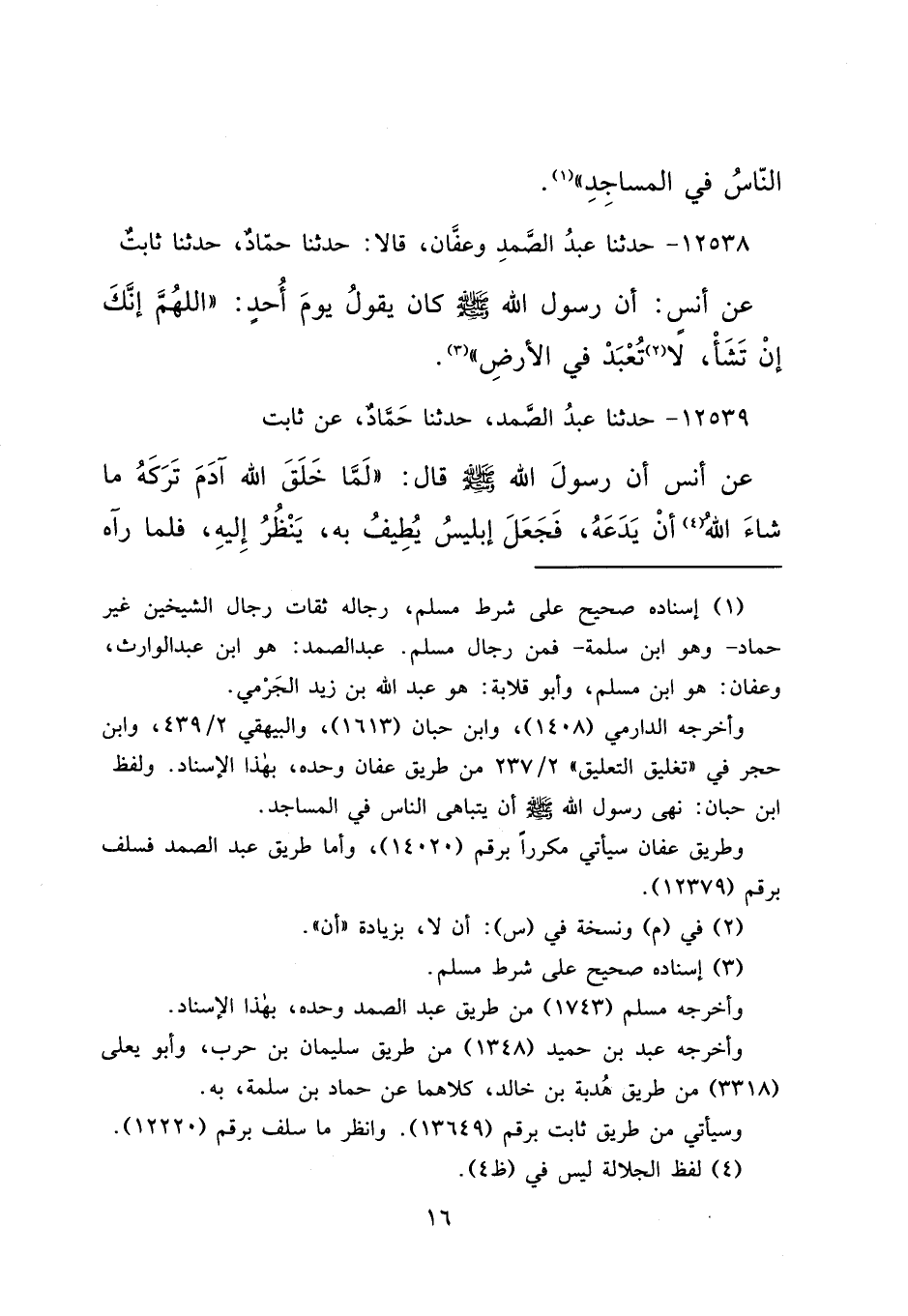 ١٢٥٣٨ - حَدَّثَنَا عَبْدُ الصَّمَدِ، وَعَفَّانُ، قَالَا: حَدَّثَنَا حَمَّادٌ، حَدَّثَنَا ثَابِتٌ، عَنْ أَنَسٍ، أَنَّ رَسُولَ اللهِ صَلَّى اللهُ عَلَيْهِ وَسَلَّمَ كَانَ يَقُولُ يَوْمَ أُحُدٍ: " اللهُمَّ إِنَّكَ إِنْ تَشَأْ أَنْ لَا (٢) تُعْبَدَ فِي الْأَرْضِ " (٣)