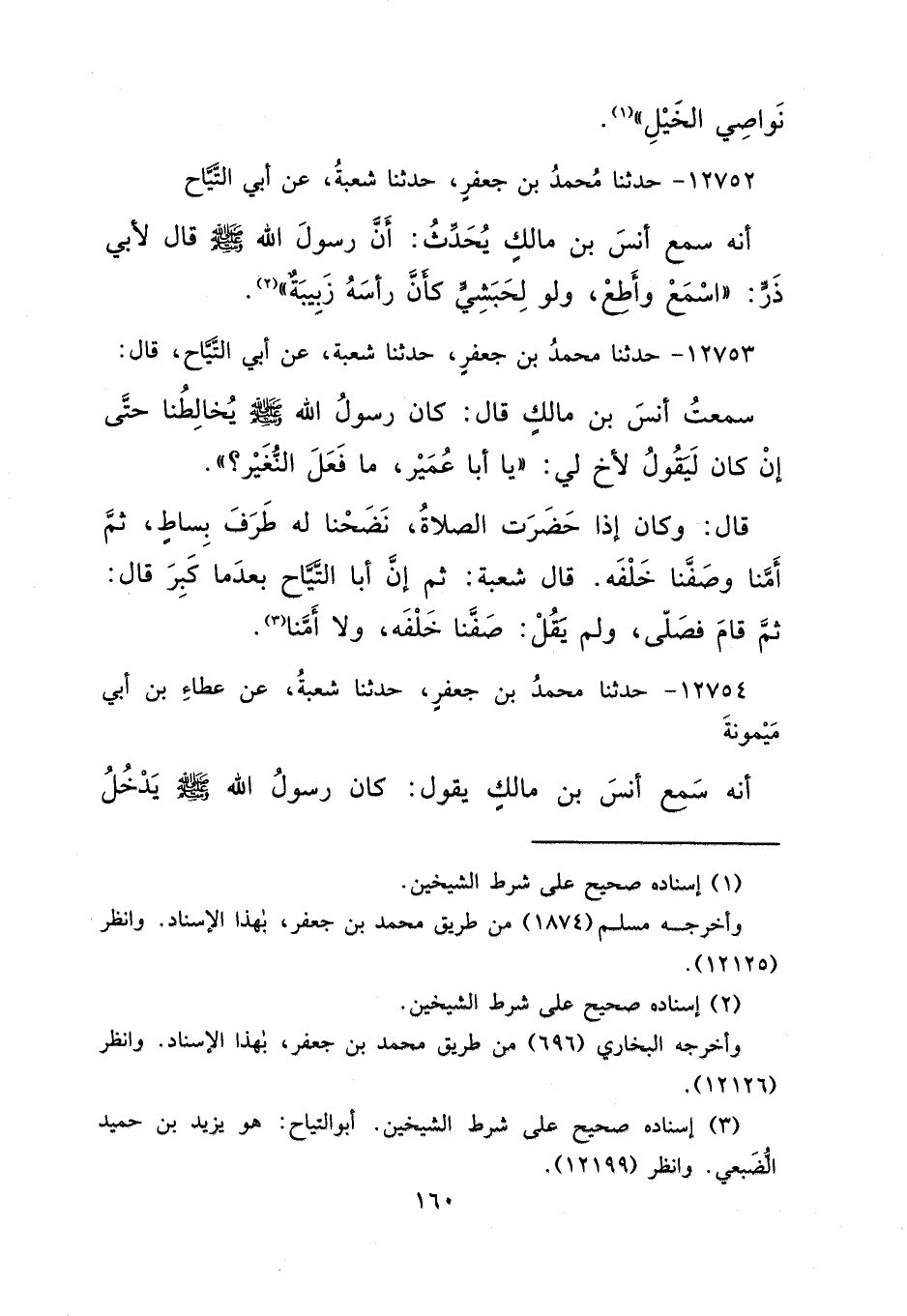 ١٢٧٥٣ - حَدَّثَنَا مُحَمَّدُ بْنُ جَعْفَرٍ، حَدَّثَنَا شُعْبَةُ، عَنْ أَبِي التَّيَّاحِ، قَالَ: سَمِعْتُ أَنَسَ بْنَ مَالِكٍ قَالَ: كَانَ رَسُولُ اللهِ صَلَّى اللهُ عَلَيْهِ وَسَلَّمَ، يُخَالِطُنَا، حَتَّى إِنْ كَانَ لَيَقُولُ لِأَخٍ لِي: " يَا أَبَا عُمَيْرٍ مَا فَعَلَ النُّغَيْرُ ". قَالَ: وَكَانَ إِذَا حَضَرَتِ الصَّلَاةُ، نَضَحْنَا لَهُ طَرَفَ بِسَاطٍ، ثُمَّ أَمَّنَا، وَصَفَّنَا خَلْفَهُ قَالَ: شُعْبَةُ: " ثُمَّ إِنَّ أَبَا التَّيَّاحِ بَعْدَمَا كَبِرَ، قَالَ: ثُمَّ قَامَ فَصَلَّى، وَلَمْ يَقُلْ صَفَّنَا خَلْفَهُ، وَلَا أَمَّنَا " (٣)