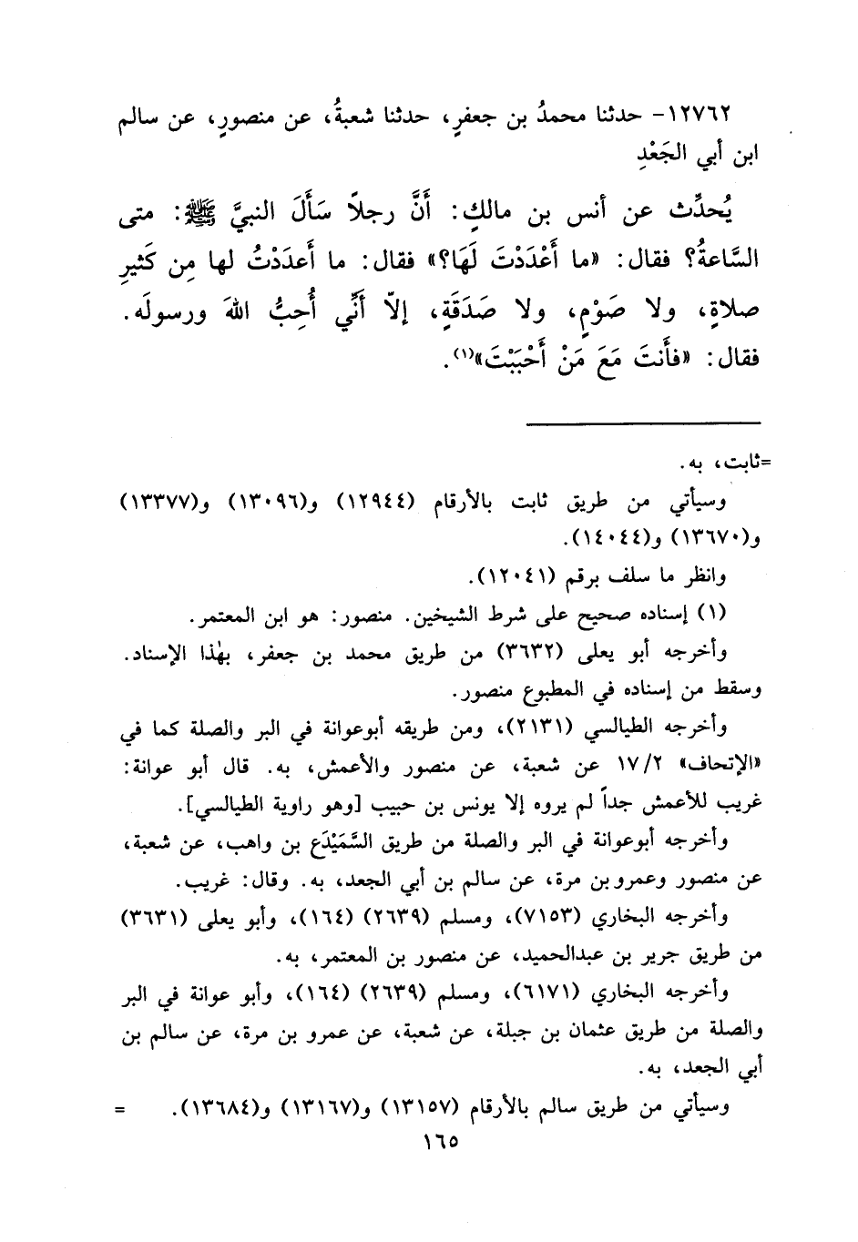 ١٢٧٦٢ - حَدَّثَنَا مُحَمَّدُ بْنُ جَعْفَرٍ، حَدَّثَنَا شُعْبَةُ، عَنْ مَنْصُورٍ، عَنْ سَالِمِ بْنِ أَبِي الْجَعْدِ، يُحَدِّثُ، عَنْ أَنَسِ بْنِ مَالِكٍ، أَنَّ رَجُلًا سَأَلَ النَّبِيَّ صَلَّى اللهُ عَلَيْهِ وَسَلَّمَ: مَتَى السَّاعَةُ؟ فَقَالَ: " مَا أَعْدَدْتَ لَهَا؟ "، فَقَالَ: مَا أَعْدَدْتُ لَهَا مِنْ كَثِيرِ صَلَاةٍ، وَلَا صَوْمٍ، وَلَا صَدَقَةٍ، إِلَّا أَنِّي أُحِبُّ اللهَ وَرَسُولَهُ. فَقَالَ: " فَأَنْتَ مَعَ مَنْ أَحْبَبْتَ " (١)