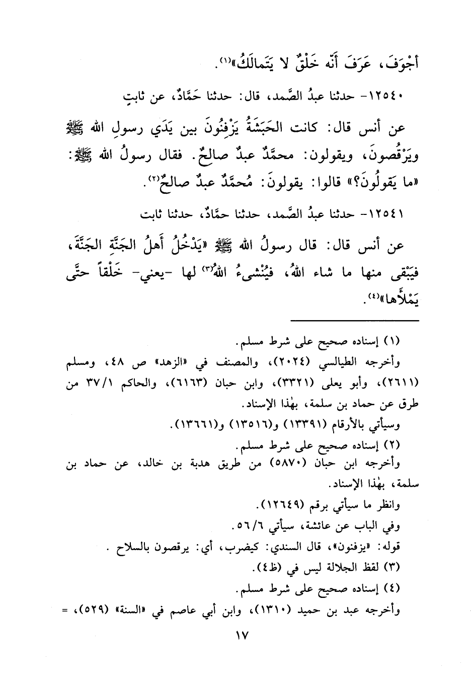 ١٢٥٤٠ - حَدَّثَنَا عَبْدُ الصَّمَدِ قَالَ: حَدَّثَنَا حَمَّادٌ، عَنْ ثَابِتٍ، عَنْ أَنَسٍ قَالَ: كَانَتِ الْحَبَشَةُ يَزْفِنُونَ بَيْنَ يَدَيْ رَسُولِ اللهِ صَلَّى اللهُ عَلَيْهِ وَسَلَّمَ وَيَرْقُصُونَ وَيَقُولُونَ: مُحَمَّدٌ عَبْدٌ صَالِحٌ، فَقَالَ رَسُولُ اللهِ صَلَّى اللهُ عَلَيْهِ وَسَلَّمَ: " مَا يَقُولُونَ؟ " قَالُوا: يَقُولُونَ: مُحَمَّدٌ عَبْدٌ صَالِحٌ (٢)