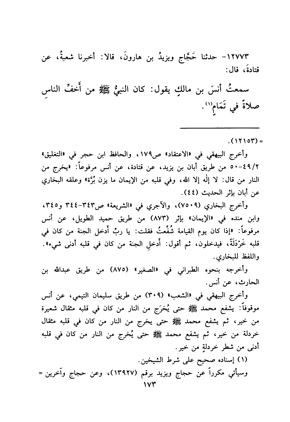 ١٢٧٧٣ - حَدَّثَنَا حَجَّاجٌ، وَيَزِيدُ بْنُ هَارُونَ، قَالَا: أَخْبَرَنَا شُعْبَةُ، عَنْ قَتَادَةَ، قَالَ: سَمِعْتُ أَنَسَ بْنَ مَالِكٍ يَقُولُ: " كَانَ النَّبِيُّ صَلَّى اللهُ عَلَيْهِ وَسَلَّمَ مِنْ أَخَفِّ النَّاسِ صَلَاةً فِي تَمَامٍ " (١)