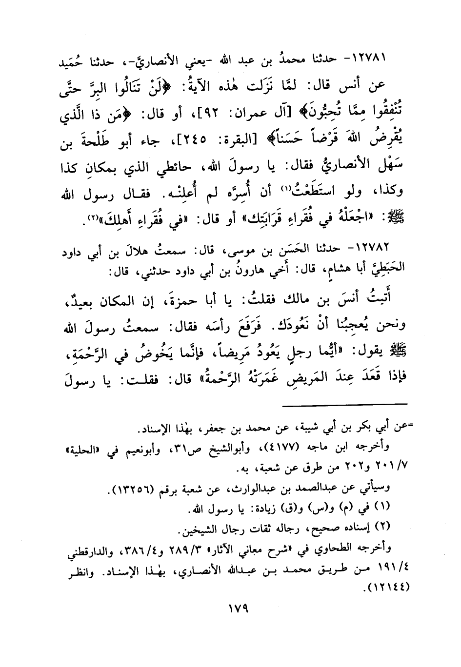 ١٢٧٨١ - حَدَّثَنَا مُحَمَّدُ بْنُ عَبْدِ اللهِ يَعْنِي الْأَنْصَارِيَّ، حَدَّثَنَا حُمَيْدٌ، عَنْ أَنَسٍ قَالَ: لَمَّا نَزَلَتْ هَذِهِ الْآيَةُ: {لَنْ تَنَالُوا الْبِرَّ حَتَّى تُنْفِقُوا مِمَّا تُحِبُّونَ} [آل عمران: ٩٢] أَوْ قَالَ: {مَنْ ذَا الَّذِي يُقْرِضُ اللهَ قَرْضًا حَسَنًا} [البقرة: ٢٤٥] جَاءَ أَبُو طَلْحَةَ بْنُ سَهْلٍ الْأَنْصَارِيُّ فَقَالَ: يَا رَسُولَ اللهِ، حَائِطِي الَّذِي بِمَكَانِ كَذَا وَكَذَا وَلَوِ اسْتَطَعْتُ (١) أَنْ أُسِرَّهُ لَمْ أُعْلِنْهُ، فَقَالَ رَسُولُ اللهِ صَلَّى اللهُ عَلَيْهِ وَسَلَّمَ: " اجْعَلْهُ فِي فُقَرَاءِ قَرَابَتِكَ - أَوْ قَالَ: فِي فُقَرَاءِ أَهْلِكَ - " (٢)