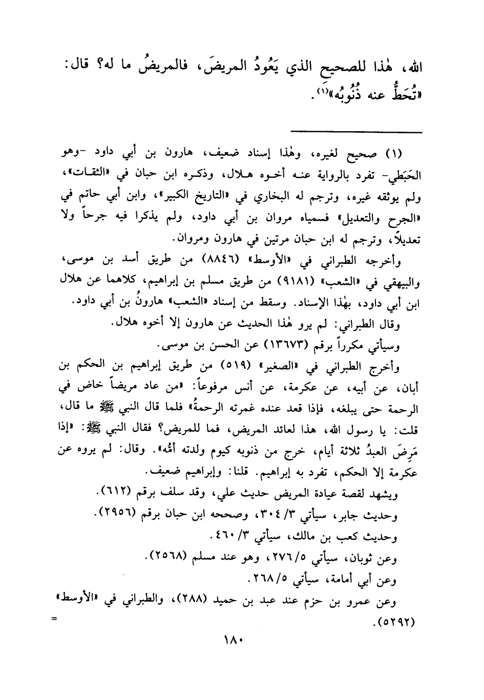 وأخرج الطبراني في "الصغير" (٥١٩) من طريق إبراهيم بن الحكم بن أبان، عن أبيه، عن عكرمة، عن أنس مرفوعاً: "من عاد مريضاً خاض في الرحمة حتى يبلغه، فإذا قعد عنده غمرته الرحمةُ" فلما قال النبي صَلَّى اللهُ عَلَيْهِ وَسَلَّمَ ما قال، قلت: يا رسول الله، هذا لعائد المريض، فما للمريض؟ فقال النبي صَلَّى اللهُ عَلَيْهِ وَسَلَّمَ: "إذا مرِض العبدُ ثلاثة أيام، خرج من ذنوبه كيوم ولدته أمُه". وقال: لم يروه عن عكرمة إلا الحكم، تفرد به إبراهيم. قلنا: وإبراهيم ضعيف.