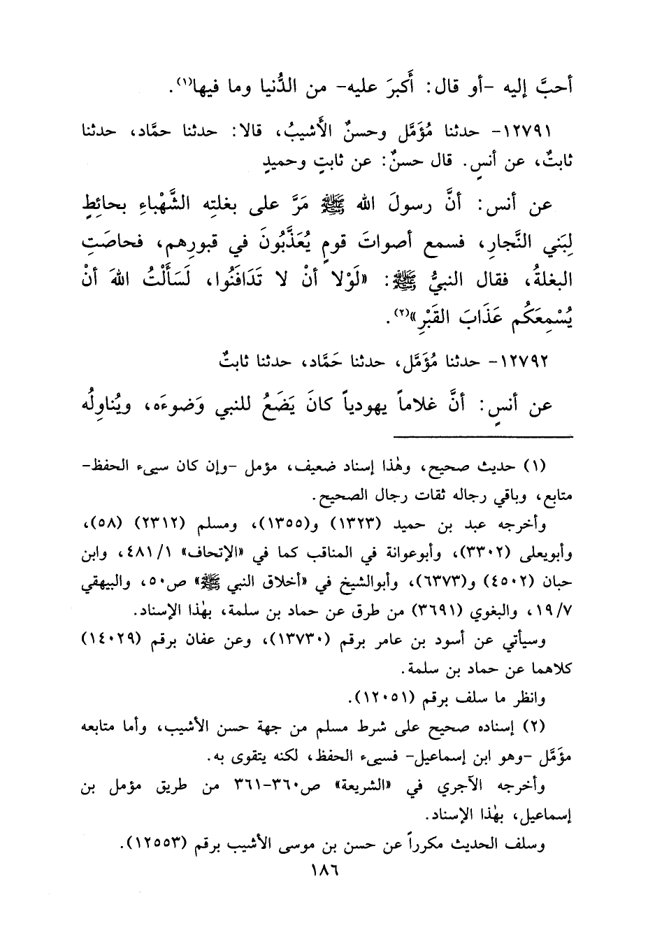 ١٢٧٩١ - حَدَّثَنَا مُؤَمَّلٌ، وَحَسَنٌ الْأَشْيَبُ، قَالَا: حَدَّثَنَا حَمَّادٌ، حَدَّثَنَا ثَابِتٌ، عَنْ أَنَسٍ، قَالَ حَسَنٌ: عَنْ ثَابِتٍ، وَحُمَيْدٍ، عَنْ أَنَسٍ، أَنَّ رَسُولَ اللهِ صَلَّى اللهُ عَلَيْهِ وَسَلَّمَ مَرَّ عَلَى بَغْلَتِهِ الشَّهْبَاءِ بِحَائِطٍ لِبَنِي النَّجَّارِ، فَسَمِعَ أَصْوَاتَ قَوْمٍ يُعَذَّبُونَ فِي قُبُورِهِمْ، فَحَاصَتِ الْبَغْلَةُ. فَقَالَ النَّبِيُّ صَلَّى اللهُ عَلَيْهِ وَسَلَّمَ: " لَوْلَا أَنْ لَا تَدَافَنُوا، لَسَأَلْتُ اللهَ أَنْ يُسْمِعَكُمْ عَذَابَ الْقَبْرِ " (٢)