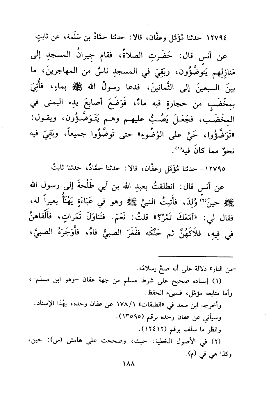 ١٢٧٩٤ - حَدَّثَنَا مُؤَمَّلٌ، وَعَفَّانُ، قَالَا: حَدَّثَنَا حَمَّادُ بْنُ سَلَمَةَ، عَنْ ثَابِتٍ، عَنْ أَنَسٍ قَالَ: حَضَرَتِ الصَّلَاةُ، فَقَامَ جِيرَانُ الْمَسْجِدِ إِلَى مَنَازِلِهِمْ يَتَوَضَّئُونَ، وَبَقِيَ فِي الْمَسْجِدِ نَاسٌ مِنَ الْمُهَاجِرِينَ مَا بَيْنَ السَّبْعِينَ إِلَى الثَّمَانِينَ، فَدَعَا رَسُولُ اللهِ صَلَّى اللهُ عَلَيْهِ وَسَلَّمَ بِمَاءٍ، فَأُتِيَ بِمِخْضَبٍ مِنْ حِجَارَةٍ فِيهِ مَاءٌ، فَوَضَعَ أَصَابِعَ يَدِهِ الْيُمْنَى فِي الْمِخْضَبِ، فَجَعَلَ يَصُبُّ عَلَيْهِمْ وَهُمْ يَتَوَضَّئُونَ وَيَقُولُ: " تَوَضَّئُوا، حَيَّ عَلَى الْوُضُوءِ "، حَتَّى تَوَضَّئُوا جَمِيعًا، وَبَقِيَ فِيهِ نَحْوٌ مِمَّا كَانَ فِيهِ (١)