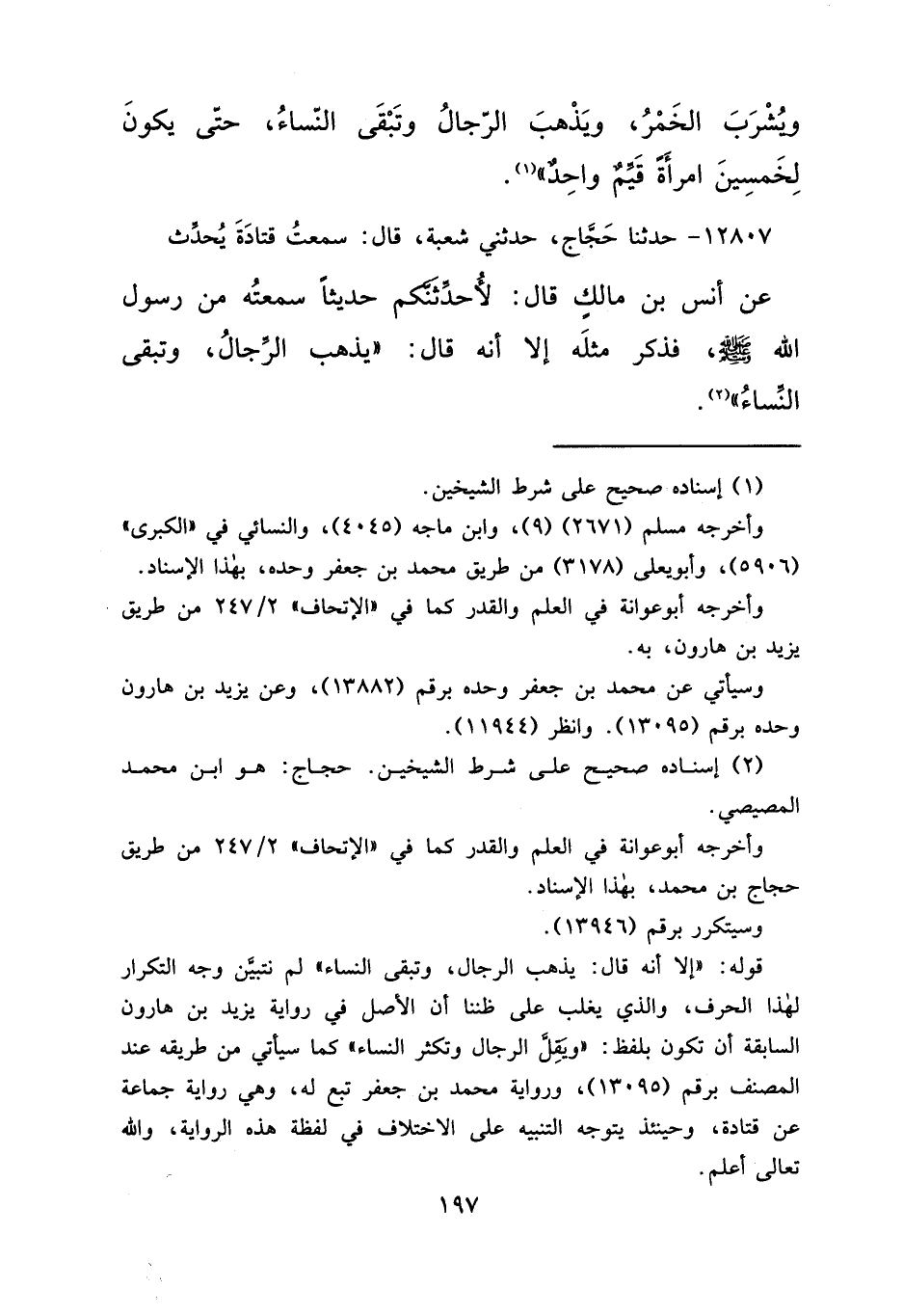 ١٢٨٠٧ - حَدَّثَنَا حَجَّاجٌ، حَدَّثَنِي شُعْبَةُ، قَالَ: سَمِعْتُ قَتَادَةَ يُحَدِّثُ، عَنْ أَنَسِ بْنِ مَالِكٍ قَالَ: لَأُحَدِّثَنَّكُمْ حَدِيثًا سَمِعْتُهُ مِنْ رَسُولِ اللهِ صَلَّى اللهُ عَلَيْهِ وَسَلَّمَ، فَذَكَرَ مِثْلَهُ إِلَّا أَنَّهُ قَالَ: " يَذْهَبُ الرِّجَالُ وتَبْقَى النِّسَاءُ " (٢)