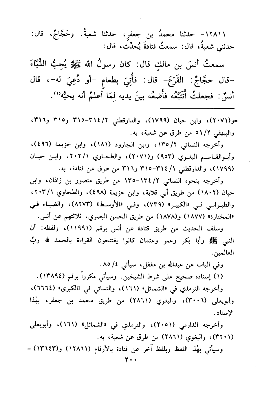 ١٢٨١١ - حَدَّثَنَا مُحَمَّدُ بْنُ جَعْفَرٍ، حَدَّثَنَا شُعْبَةُ، وَحَجَّاجٌ، قَالَ: حَدَّثَنِي شُعْبَةُ، قَالَ: سَمِعْتُ قَتَادَةَ يُحَدِّثُ، قَالَ: سَمِعْتُ أَنَسَ بْنَ مَالِكٍ قَالَ: " كَانَ رَسُولُ اللهِ صَلَّى اللهُ عَلَيْهِ وَسَلَّمَ يُحِبُّ الدُّبَّاءَ " - قَالَ حَجَّاجٌ: الْقَرْعَ -، قَالَ: فَأُتِيَ بِطَعَامٍ - أَوْ دُعِيَ لَهُ - قَالَ أَنَسٌ فَجَعَلْتُ أَتَتَبَّعُهُ، فَأَضَعُهُ بَيْنَ يَدَيْهِ لِمَا أَعْلَمُ أَنَّهُ يُحِبُّهُ (١)