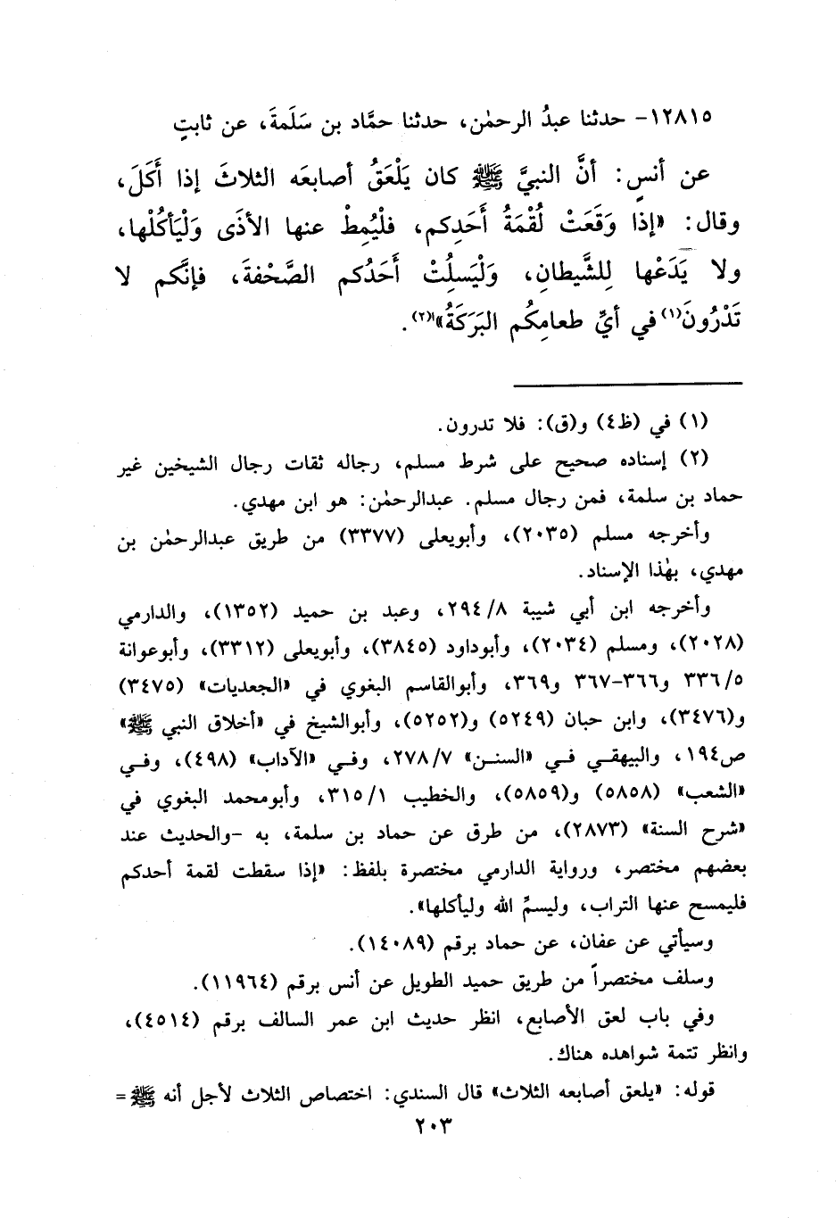 ١٢٨١٥ - حَدَّثَنَا عَبْدُ الرَّحْمَنِ، حَدَّثَنَا حَمَّادُ بْنُ سَلَمَةَ، عَنْ ثَابِتٍ، عَنْ أَنَسٍ، أَنَّ النَّبِيَّ صَلَّى اللهُ عَلَيْهِ وَسَلَّمَ كَانَ يَلْعَقُ أَصَابِعَهُ الثَّلَاثَ إِذَا أَكَلَ، وَقَالَ: " إِذَا وَقَعَتْ لُقْمَةُ أَحَدِكُمْ، فَلْيُمِطْ عَنْهَا الْأَذَى، وَلْيَأْكُلْهَا، وَلَا يَدَعْهَا لِلشَّيْطَانِ، وَلْيَسْلُتْ أَحَدُكُمُ الصَّحْفَةَ، فَإِنَّكُمْ لَا تَدْرُونَ (١) فِي أَيِّ طَعَامِكُمُ الْبَرَكَةَ " (٢)