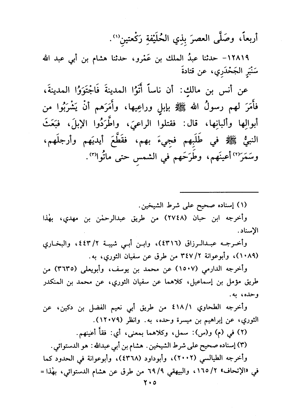 ١٢٨١٩ - حَدَّثَنَا عَبْدُ الْمَلِكِ بْنُ عَمْرٍو، حَدَّثَنَا هِشَامُ بْنُ أَبِي عَبْدِ اللهِ سَنْبَرٌ الْجَحْدَرِيُّ، عَنْ قَتَادَةَ، عَنْ أَنَسِ بْنِ مَالِكٍ، أَنَّ نَاسًا أَتَوْا الْمَدِينَةَ، فَاجْتَوَوْا الْمَدِينَةَ، " فَأَمَرَ لَهُمْ رَسُولُ اللهِ صَلَّى اللهُ عَلَيْهِ وَسَلَّمَ بِإِبِلٍ وَرَاعِيهَا، وَأَمَرَهُمْ أَنْ يَشْرَبُوا مِنْ أَبْوَالِهَا وَأَلْبَانِهَا "، قَالَ: فَقَتَلُوا الرَّاعِيَ، وَأَطْرَدُوا الْإِبِلَ، " فَبَعَثَ النَّبِيُّ صَلَّى اللهُ عَلَيْهِ وَسَلَّمَ فِي طَلَبِهِمْ، فَجِيءَ بِهِمْ، فَقَطَّعَ أَيْدِيَهُمْ وَأَرْجُلَهُمْ، وَسَمَرَ (٢) أَعْيُنَهُمْ، وَطَرَحَهُمْ فِي الشَّمْسِ حَتَّى مَاتُوا " (٣)
