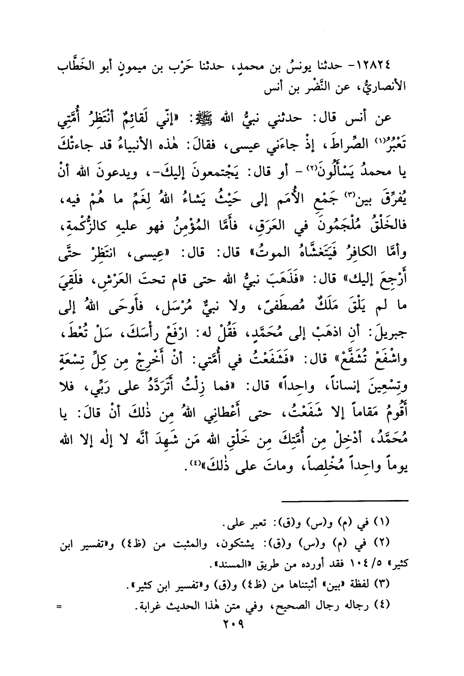 ١٢٨٢٤ - حَدَّثَنَا يُونُسُ بْنُ مُحَمَّدٍ، حَدَّثَنَا حَرْبُ بْنُ مَيْمُونٍ أَبُو الْخَطَّابِ الْأَنْصَارِيُّ، عَنِ النَّضْرِ بْنِ أَنَسٍ، عَنْ أَنَسٍ قَالَ: حَدَّثَنِي نَبِيُّ اللهِ صَلَّى اللهُ عَلَيْهِ وَسَلَّمَ: " إِنِّي لَقَائِمٌ أَنْتَظِرُ أُمَّتِي تَعْبُرُ (١) الصِّرَاطِ، إِذْ جَاءَنِي عِيسَى فَقَالَ: هَذِهِ الْأَنْبِيَاءُ قَدْ جَاءَتْكَ يَا مُحَمَّدُ يَسْأَلُونَ (٢) - أَوْ قَالَ: يَجْتَمِعُونَ إِلَيْكَ - وَيَدْعُونَ اللهَ، أَنْ يُفَرِّقَ بَيْنَ (٣) جَمْعِ الْأُمَمِ، إِلَى حَيْثُ يَشَاءُ اللهُ، لِغَمِّ مَا هُمْ فِيهِ فَالْخَلْقُ مُلْجَمُونَ فِي الْعَرَقِ. فَأَمَّا الْمُؤْمِنُ، فَهُوَ عَلَيْهِ كَالزَّكْمَةِ، وَأَمَّا الْكَافِرُ فَيَتَغَشَّاهُ الْمَوْتُ ". قَالَ: " قَالَ عِيسَى: انْتَظِرْ حَتَّى أَرْجِعَ إِلَيْكَ، قَالَ: فَذَهَبَ نَبِيُّ اللهِ صَلَّى اللهُ عَلَيْهِ وَسَلَّمَ حَتَّى قَامَ تَحْتَ الْعَرْشِ، فَلَقِيَ مَا لَمْ يَلْقَ مَلَكٌ مُصْطَفًى، وَلَا نَبِيٌّ مُرْسَلٌ، فَأَوْحَى اللهُ إِلَى جِبْرِيلَ: أَنِ اذْهَبْ إِلَى مُحَمَّدٍ فَقُلْ لَهُ: ارْفَعْ رَأْسَكَ، سَلْ تُعْطَ، وَاشْفَعْ تُشَفَّعْ. قَالَ: فَشُفِّعْتُ فِي أُمَّتِي، أَنْ أُخْرِجَ مِنْ كُلِّ تِسْعَةٍ وَتِسْعِينَ إِنْسَانًا وَاحِدًا، قَالَ: فَمَا زِلْتُ أَتَرَدَّدُ عَلَى رَبِّي، فَلَا أَقُومُ مَقَامًا إِلَّا شُفِّعْتُ، حَتَّى أَعْطَانِي اللهُ مِنْ ذَلِكَ، أَنْ قَالَ: يَا مُحَمَّدُ أَدْخِلْ مِنْ أُمَّتِكَ مِنْ خَلْقِ اللهِ، مَنْ شَهِدَ أَنَّهُ لَا إِلَهَ إِلَّا اللهُ يَوْمًا وَاحِدًا مُخْلِصًا، وَمَاتَ عَلَى ذَلِكَ " (٤)