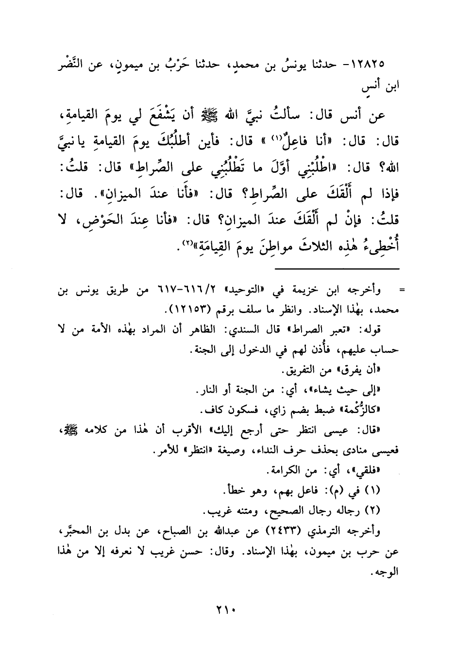 ١٢٨٢٥ - حَدَّثَنَا يُونُسُ بْنُ مُحَمَّدٍ، حَدَّثَنَا حَرْبُ بْنُ مَيْمُونٍ، عَنِ النَّضْرِ بْنِ أَنَسٍ، عَنْ أَنَسٍ قَالَ: سَأَلْتُ نَبِيَّ اللهِ صَلَّى اللهُ عَلَيْهِ وَسَلَّمَ، أَنْ يَشْفَعَ لِي يَوْمَ الْقِيَامَةِ، قَالَ: قَالَ: " أَنَا فَاعِلٌ (١) " قَالَ: فَأَيْنَ أَطْلُبُكَ يَوْمَ الْقِيَامَةِ يَا نَبِيَّ اللهِ؟ قَالَ: " اطْلُبْنِي أَوَّلَ مَا تَطْلُبُنِي عَلَى الصِّرَاطِ " قَالَ: قُلْتُ: فَإِذَا لَمْ أَلْقَكَ عَلَى الصِّرَاطِ؟ قَالَ: " فَأَنَا عِنْدَ الْمِيزَانِ " قَالَ: قُلْتُ: فَإِنْ لَمْ أَلْقَكَ عِنْدَ الْمِيزَانِ؟ قَالَ: " فَأَنَا عِنْدَ الْحَوْضِ، لَا أُخْطِئُ هَذِهِ الثَّلَاثَ مَوَاطِنَ يَوْمَ الْقِيَامَةِ " (٢)