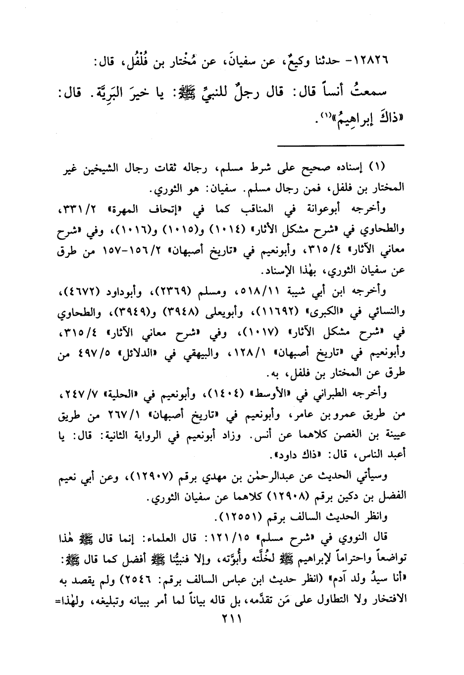 ١٢٨٢٦ - حَدَّثَنَا وَكِيعٌ، عَنْ سُفْيَانَ، عَنْ مُخْتَارِ بْنِ فُلْفُلٍ، قَالَ: سَمِعْتُ أَنَسًا، قَالَ: قَالَ رَجُلٌ لِلنَّبِيِّ صَلَّى اللهُ عَلَيْهِ وَسَلَّمَ: يَا خَيْرَ الْبَرِيَّةِ، قَالَ: " ذَاكَ إِبْرَاهِيمُ " (١)