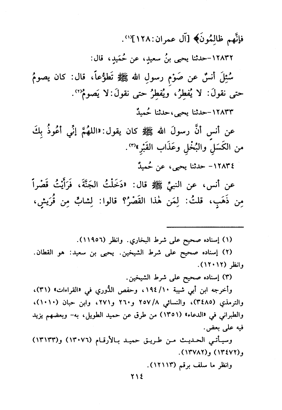 ١٢٨٣٣ - حَدَّثَنَا يَحْيَى، حَدَّثَنَا حُمَيْدٌ، عَنْ أَنَسٍ، أَنَّ رَسُولَ اللهِ صَلَّى اللهُ عَلَيْهِ وَسَلَّمَ كَانَ يَقُولُ: " اللهُمَّ إِنِّي أَعُوذُ بِكَ مِنَ الْكَسَلِ وَالْبُخْلِ وَعَذَابِ الْقَبْرِ " (٣)