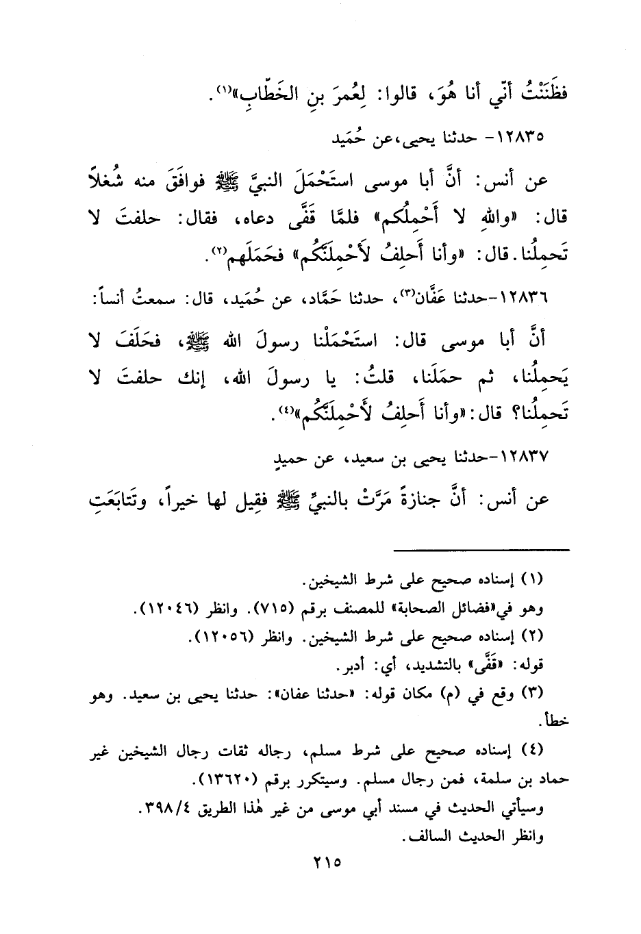 ١٢٨٣٥ - حَدَّثَنَا يَحْيَى، عَنْ حُمَيْدٍ، عَنْ أَنَسٍ، أَنَّ أَبَا مُوسَى اسْتَحْمَلَ النَّبِيَّ صَلَّى اللهُ عَلَيْهِ وَسَلَّمَ، فَوَافَقَ مِنْهُ شُغْلًا، قَالَ: " وَاللهِ لَا أَحْمِلُكُمْ ". فَلَمَّا قَفَّى دَعَاهُ، فَقَالَ: حَلَفْتَ لَا تَحْمِلُنَا. قَالَ: " وَأَنَا أَحْلِفُ لَأَحْمِلَنَّكُمْ "، فَحَمَلَهُمْ (٢)