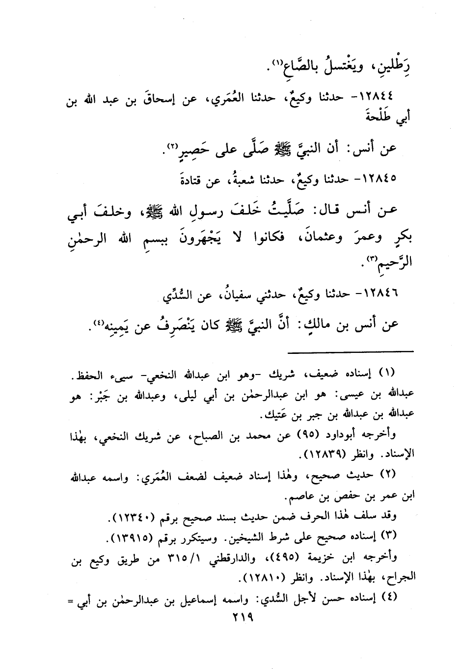 ١٢٨٤٥ - حَدَّثَنَا وَكِيعٌ، حَدَّثَنَا شُعْبَةُ، عَنْ قَتَادَةَ، عَنْ أَنَسٍ قَالَ: " صَلَّيْتُ خَلْفَ رَسُولِ اللهِ صَلَّى اللهُ عَلَيْهِ وَسَلَّمَ، وَخَلْفَ أَبِي بَكْرٍ، وَعُمَرَ، وَعُثْمَانَ فَكَانُوا لَا يَجْهَرُونَ: بِـ {بِسْمِ اللهِ الرَّحْمَنِ الرَّحِيمِ} [الفاتحة: ١] " (٣)