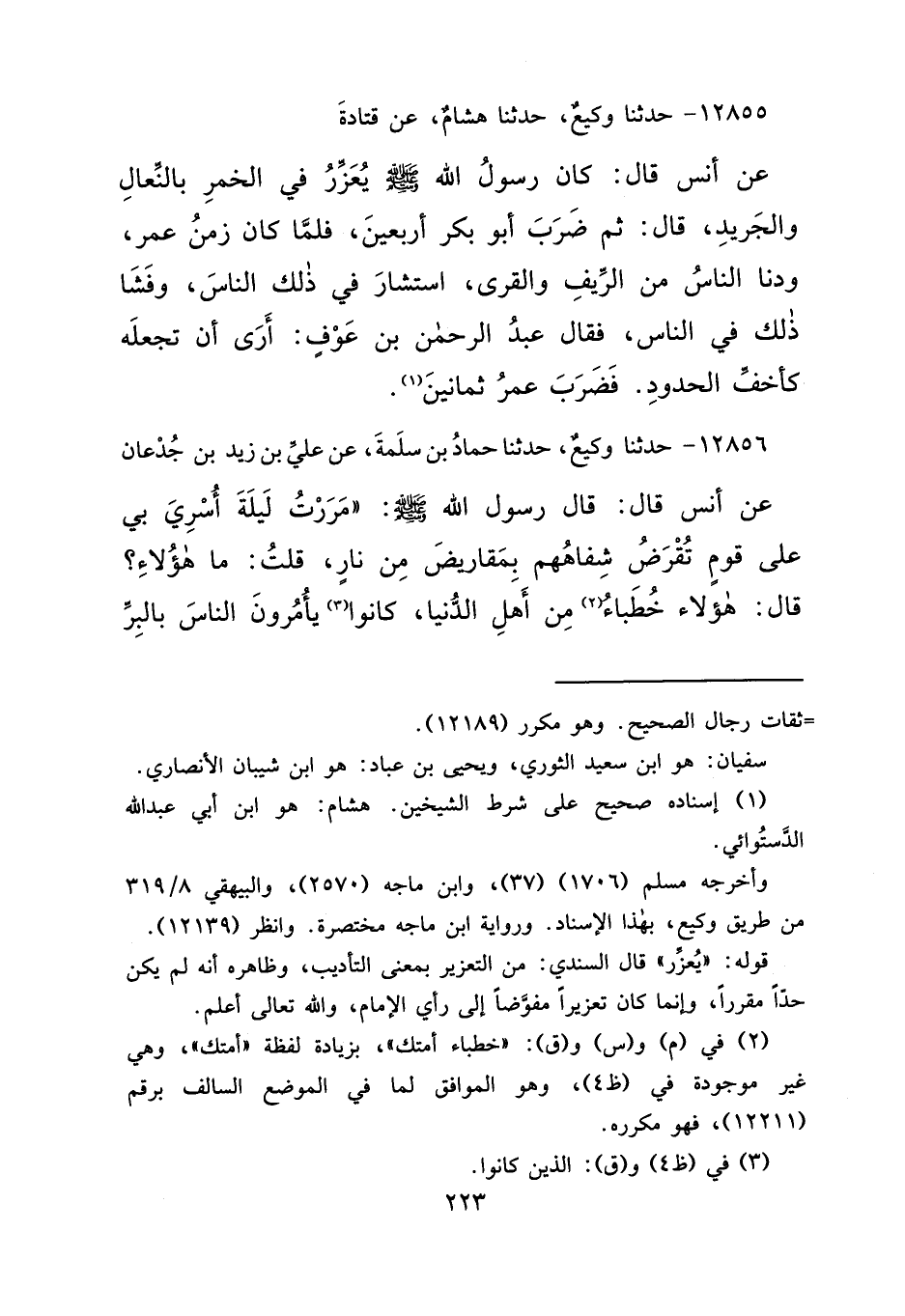١٢٨٥٥ - حَدَّثَنَا وَكِيعٌ، حَدَّثَنَا هِشَامٌ، عَنْ قَتَادَةَ، عَنْ أَنَسٍ قَالَ: " كَانَ رَسُولُ اللهِ صَلَّى اللهُ عَلَيْهِ وَسَلَّمَ يُعَزِّرُ فِي الْخَمْرِ بِالنِّعَالِ وَالْجَرِيدِ " قَالَ: " ثُمَّ ضَرَبَ أَبُو بَكْرٍ أَرْبَعِينَ، فَلَمَّا كَانَ زَمَنُ عُمَرَ وَدَنَا النَّاسُ مِنَ الرِّيفِ وَالْقُرَى، اسْتَشَارَ فِي ذَلِكَ النَّاسَ، وَفَشَا ذَلِكَ فِي النَّاسِ، فَقَالَ عَبْدُ الرَّحْمَنِ بْنُ عَوْفٍ: أَرَى أَنْ تَجْعَلَهُ كَأَخَفِّ الْحُدُودِ، " فَضَرَبَ عُمَرُ ثَمَانِينَ " (١)