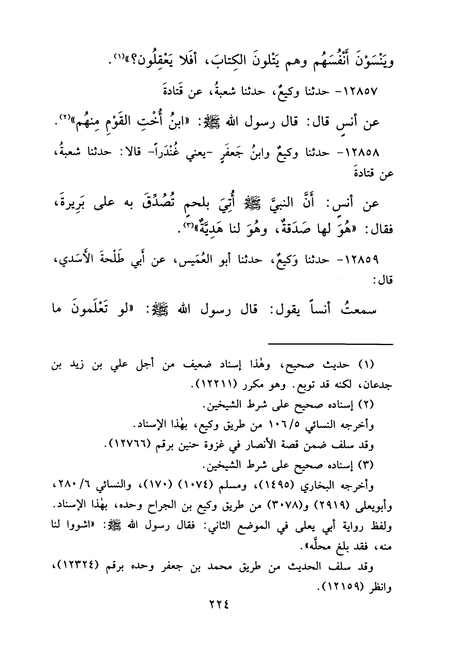 ١٢٨٥٨ - حَدَّثَنَا وَكِيعٌ، وَابْنُ جَعْفَرٍ يَعْنِي غُنْدَرًا، قَالَا: حَدَّثَنَا شُعْبَةُ، عَنْ قَتَادَةَ، عَنْ أَنَسٍ، أَنَّ النَّبِيَّ صَلَّى اللهُ عَلَيْهِ وَسَلَّمَ أُتِيَ بِلَحْمٍ تُصُدِّقَ بِهِ عَلَى بَرِيرَةَ، فَقَالَ: " هُوَ لَهَا صَدَقَةٌ، وَهُوَ لَنَا هَدِيَّةٌ " (٣)
