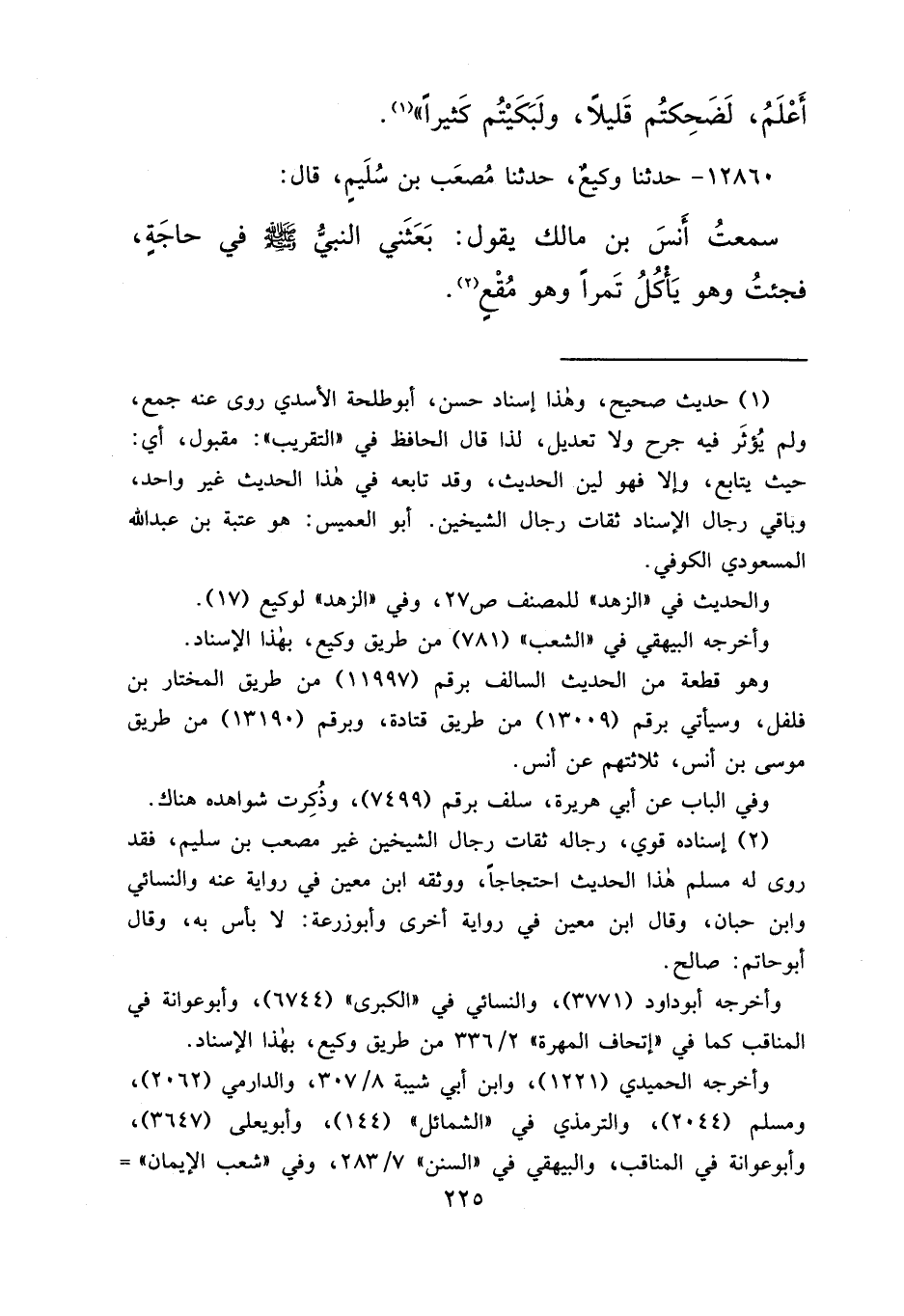 ١٢٨٦٠ - حَدَّثَنَا وَكِيعٌ، حَدَّثَنَا مُصْعَبُ بْنُ سُلَيْمٍ، قَالَ: سَمِعْتُ أَنَسَ بْنَ مَالِكٍ يَقُولُ: " بَعَثَنِي النَّبِيُّ صَلَّى اللهُ عَلَيْهِ وَسَلَّمَ فِي حَاجَةٍ، فَجِئْتُ وَهُوَ يَأْكُلُ تَمْرًا وَهُوَ مُقْعٍ " (٢)