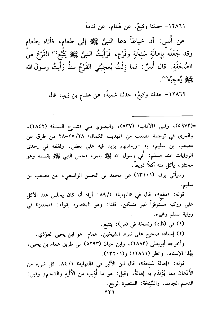 ١٢٨٦١ - حَدَّثَنَا وَكِيعٌ، عَنْ هَمَّامٍ، عَنْ قَتَادَةَ، عَنْ أَنَسٍ، أَنَّ خَيَّاطًا دَعَا النَّبِيَّ صَلَّى اللهُ عَلَيْهِ وَسَلَّمَ إِلَى طَعَامٍ، فَأَتَاهُ بِطَعَامٍ وَقَدْ جَعَلَهُ بِإِهَالَةٍ سَنِخَةٍ وَقَرْعٍ. " فَرَأَيْتُ النَّبِيَّ صَلَّى اللهُ عَلَيْهِ وَسَلَّمَ، يَتْبَعُ (١) الْقَرْعَ مِنْ الصَّحْفَةِ "، قَالَ أَنَسٌ: " فَمَا زِلْتُ يُعْجِبُنِي الْقَرْعُ مُنْذُ رَأَيْتُ رَسُولَ اللهِ صَلَّى اللهُ عَلَيْهِ وَسَلَّمَ يُعْجِبُهُ " (٢)