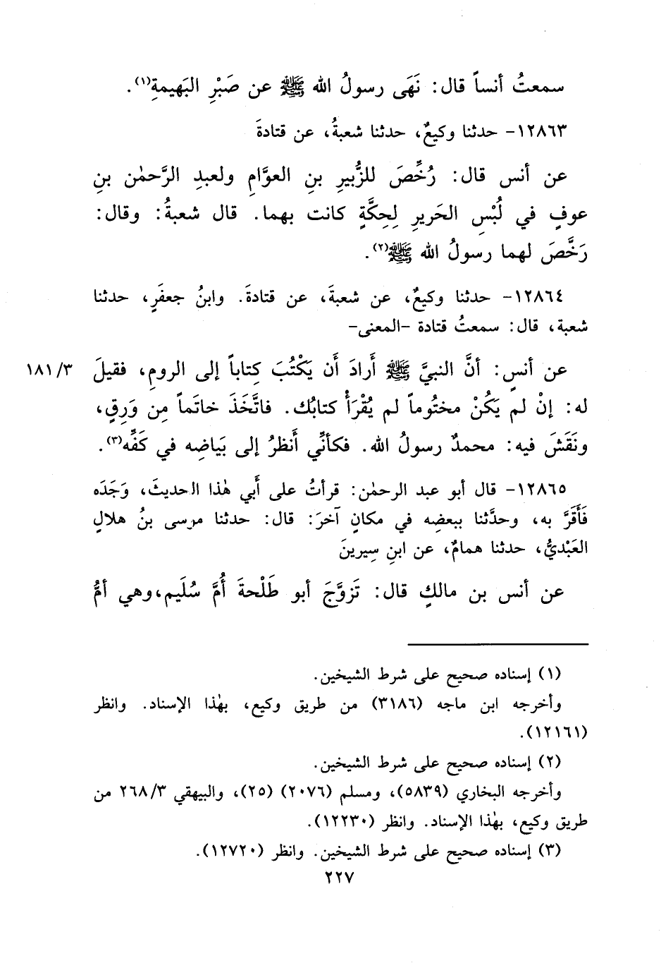 ١٢٨٦٤ - حَدَّثَنَا وَكِيعٌ، عَنْ شُعْبَةَ، عَنْ قَتَادَةَ، وَابْنُ جَعْفَرٍ، حَدَّثَنَا شُعْبَةُ، قَالَ: سَمِعْتُ قَتَادَةَ، الْمَعْنَى، عَنْ أَنَسٍ، " أَنَّ النَّبِيَّ صَلَّى اللهُ عَلَيْهِ وَسَلَّمَ أَرَادَ أَنْ يَكْتُبَ كِتَابًا إِلَى الرُّومِ، فَقِيلَ لَهُ: إِنْ لَمْ يَكُنْ مَخْتُومًا لَمْ يُقْرَأْ كِتَابُكَ، " فَاتَّخَذَ خَاتَمًا مِنْ وَرِقٍ، وَنَقَشَ فِيهِ مُحَمَّدٌ رَسُولُ اللهِ، فَكَأَنِّي أَنْظُرُ إِلَى بَيَاضِهِ فِي كَفِّهِ " (٣)