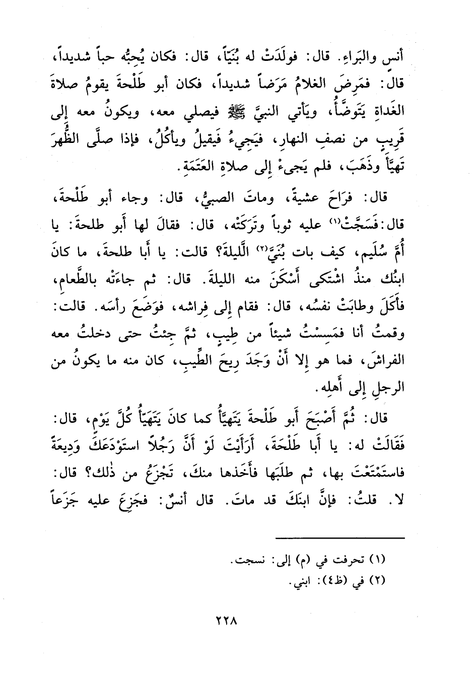 أَنَسٍ، وَالْبَرَاءِ، قَالَ: فَوَلَدَتْ لَهُ بُنَيًّا. قَالَ: فَكَانَ يُحِبُّهُ حُبًّا شَدِيدًا. قَالَ: فَمَرِضَ الْغُلَامُ مَرَضًا شَدِيدًا، فَكَانَ أَبُو طَلْحَةَ يَقُومُ صَلَاةَ الْغَدَاةِ يَتَوَضَّأُ، وَيَأْتِي النَّبِيَّ صَلَّى اللهُ عَلَيْهِ وَسَلَّمَ فَيُصَلِّي مَعَهُ، وَيَكُونُ مَعَهُ إِلَى قَرِيبٍ مِنْ نِصْفِ النَّهَارِ، فَيَجِيءُ فَيَقِيلُ وَيَأْكُلُ، فَإِذَا صَلَّى الظُّهْرَ تَهَيَّأَ وَذَهَبَ، فَلَمْ يَجِئْ إِلَى صَلَاةِ الْعَتَمَةِ. قَالَ: فَرَاحَ عَشِيَّةً، وَمَاتَ الصَّبِيُّ. قَالَ: وَجَاءَ أَبُو طَلْحَةَ، قَالَ: فَسَجَّتْ (١) عَلَيْهِ ثَوْبًا، وَتَرَكَتْهُ. قَالَ: فَقَالَ لَهَا أَبُو طَلْحَةَ: يَا أُمَّ سُلَيْمٍ، كَيْفَ بَاتَ بُنَيَّ (٢) اللَّيْلَةَ؟ قَالَتْ: يَا أَبَا طَلْحَةَ، مَا كَانَ ابْنُكَ مُنْذُ اشْتَكَى أَسْكَنَ مِنْهُ اللَّيْلَةَ، قَالَ: ثُمَّ جَاءَتْهُ بِالطَّعَامِ، فَأَكَلَ وَطَابَتْ نَفْسُهُ. قَالَ: فَقَامَ إِلَى فِرَاشِهِ، فَوَضَعَ رَأْسَهُ، قَالَتْ: وَقُمْتُ أَنَا، فَمَسِسْتُ شَيْئًا مِنْ طِيبٍ، ثُمَّ جِئْتُ حَتَّى دَخَلْتُ مَعَهُ الْفِرَاشَ، فَمَا هُوَ إِلَّا أَنْ وَجَدَ رِيحَ الطِّيبِ كَانَ مِنْهُ مَا يَكُونُ مِنَ الرَّجُلِ إِلَى أَهْلِهِ. قَالَ: ثُمَّ أَصْبَحَ أَبُو طَلْحَةَ يَتَهَيَّأُ كَمَا كَانَ يَتَهَيَّأُ كُلَّ يَوْمٍ، قَالَ: فَقَالَتْ لَهُ: يَا أَبَا طَلْحَةَ، أَرَأَيْتَ لَوْ أَنَّ رَجُلًا اسْتَوْدَعَكَ وَدِيعَةً، فَاسْتَمْتَعْتَ بِهَا، ثُمَّ طَلَبَهَا، فَأَخَذَهَا مِنْكَ تَجْزَعُ مِنْ ذَلِكَ؟ قَالَ: لَا. قَلَتْ: فَإِنَّ ابْنَكَ قَدْ مَاتَ. قَالَ أَنَسٌ: فَجَزِعَ عَلَيْهِ جَزَعًا