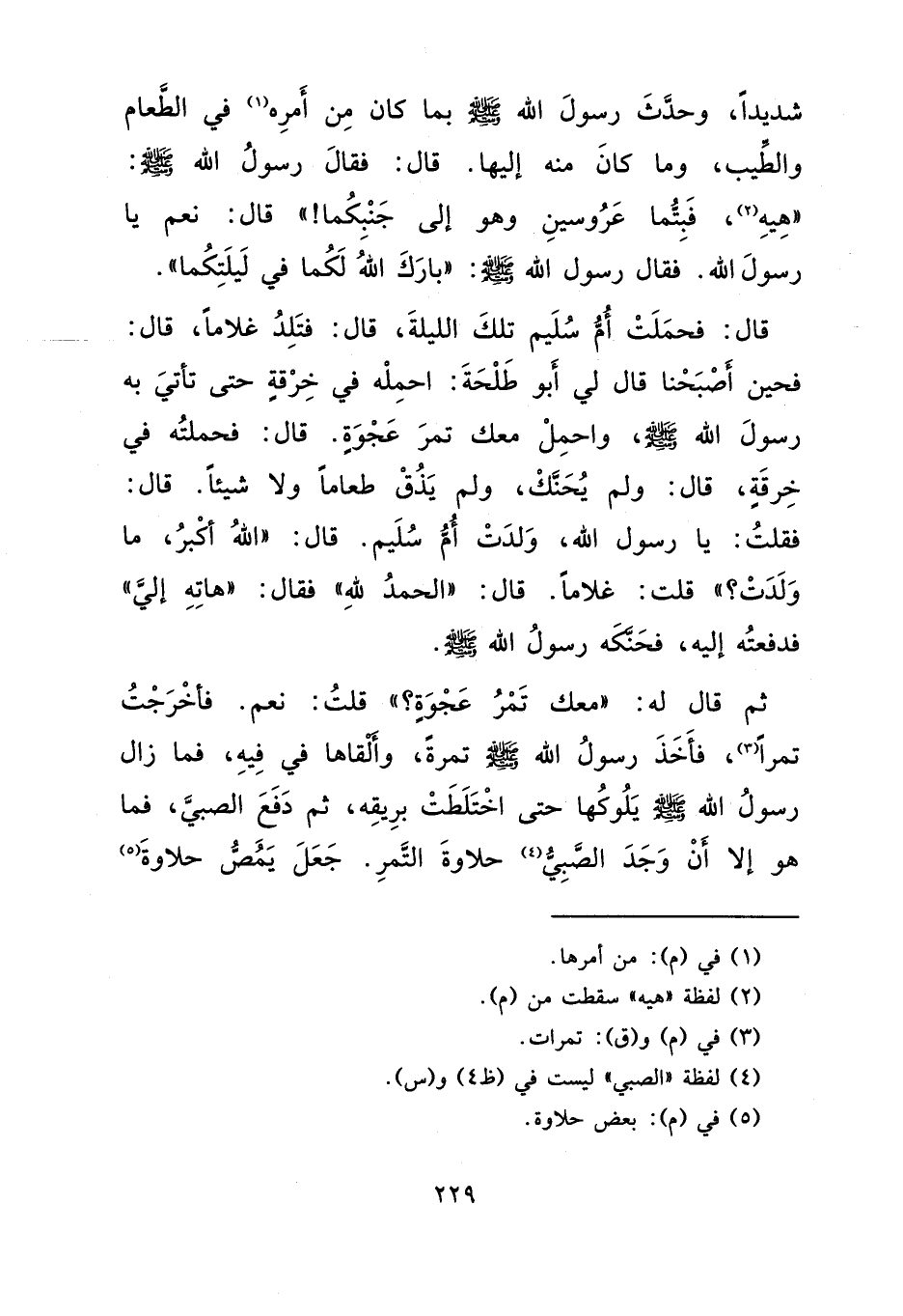 شَدِيدًا، وَحَدَّثَ رَسُولَ اللهِ صَلَّى اللهُ عَلَيْهِ وَسَلَّمَ بِمَا كَانَ مِنْ أَمْرِهِ (١) فِي الطَّعَامِ وَالطِّيبِ، وَمَا كَانَ مِنْهُ إِلَيْهَا. قَالَ: فَقَالَ رَسُولُ اللهِ صَلَّى اللهُ عَلَيْهِ وَسَلَّمَ: " هِيهِ (٢) فَبِتُّمَا عَرُوسَيْنِ وَهُوَ إِلَى جَنْبِكُمَا؟ " قَالَ: نَعَمْ يَا رَسُولَ اللهِ، فَقَالَ رَسُولُ اللهِ صَلَّى اللهُ عَلَيْهِ وَسَلَّمَ: " بَارَكَ اللهُ لَكُمَا فِي لَيْلَتِكُمَا ". قَالَ: فَحَمَلَتْ أُمُّ سُلَيْمٍ تِلْكَ اللَّيْلَةَ، قَالَ: فَتَلِدُ غُلَامًا، قَالَ: فَحِينَ أَصْبَحْنَا، قَالَ لِي أَبُو طَلْحَةَ: احْمِلْهُ فِي خِرْقَةٍ حَتَّى تَأْتِيَ بِهِ رَسُولَ اللهِ صَلَّى اللهُ عَلَيْهِ وَسَلَّمَ، وَاحْمِلْ مَعَكَ تَمْرَ عَجْوَةٍ. قَالَ: فَحَمَلْتُهُ فِي خِرْقَةٍ. قَالَ: وَلَمْ يُحَنَّكْ، وَلَمْ يَذُقْ طَعَامًا وَلَا شَيْئًا، قَالَ: فَقُلْتُ: يَا رَسُولَ اللهِ، وَلَدَتْ أُمُّ سُلَيْمٍ، قَالَ: " اللهُ أَكْبَرُ مَا وَلَدَتْ؟ " قُلْتُ: غُلَامًا، قَالَ: " الْحَمْدُ لِلَّهِ "، فَقَالَ: " هَاتِهِ إِلَيَّ "، فَدَفَعْتُهُ إِلَيْهِ، فَحَنَّكَهُ رَسُولُ اللهِ صَلَّى اللهُ عَلَيْهِ وَسَلَّمَ، ثُمَّ قَالَ لَهُ: " مَعَكَ تَمْرُ عَجْوَةٍ؟ " قُلْتُ: نَعَمْ، فَأَخْرَجْتُ تَمَرًا (٣) ، فَأَخَذَ رَسُولُ اللهِ صَلَّى اللهُ عَلَيْهِ وَسَلَّمَ تَمْرَةً وَأَلْقَاهَا فِي فِيهِ، فَمَا زَالَ رَسُولُ اللهِ صَلَّى اللهُ عَلَيْهِ وَسَلَّمَ يَلُوكُهَا حَتَّى اخْتَلَطَتْ بِرِيقِهِ، ثُمَّ دَفَعَ الصَّبِيَّ. فَمَا هُوَ إِلَّا أَنْ وَجَدَ الصَّبِيُّ (٤) حَلَاوَةَ التَّمْرِ جَعَلَ يَمُصُّ َ حَلَاوَةِ (٥)
