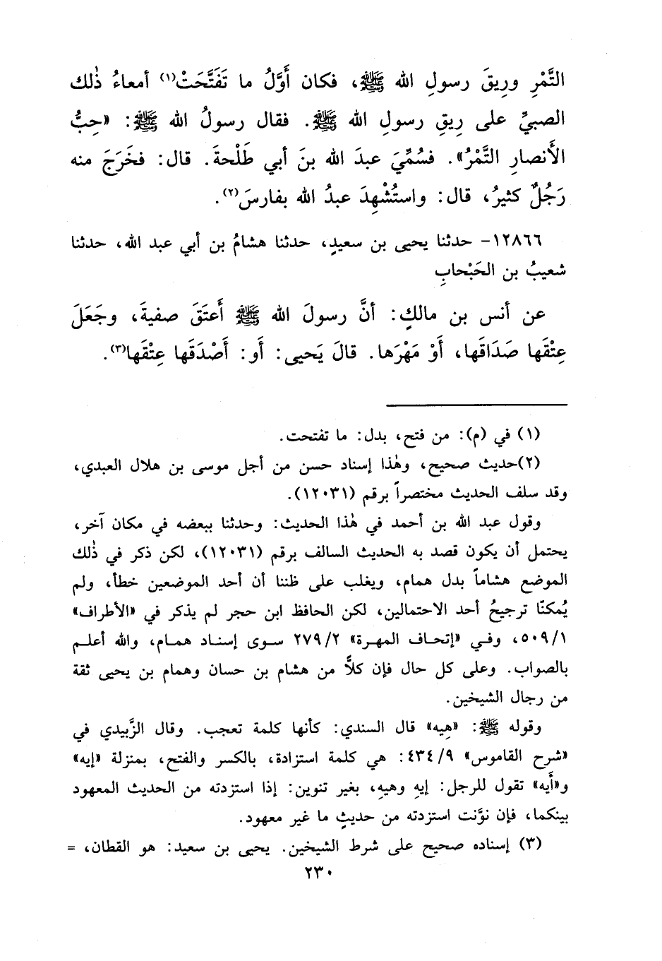 ١٢٨٦٦ - حَدَّثَنَا يَحْيَى بْنُ سَعِيدٍ، حَدَّثَنَا هِشَامُ بْنُ أَبِي عَبْدِ اللهِ، حَدَّثَنَا شُعَيْبُ بْنُ الْحَبْحَابِ، عَنْ أَنَسِ بْنِ مَالِكٍ، " أَنَّ رَسُولَ اللهِ صَلَّى اللهُ عَلَيْهِ وَسَلَّمَ أَعْتَقَ صَفِيَّةَ، وَجَعَلَ عِتْقَهَا صَدَاقَهَا - أَوْ مَهْرَهَا. قَالَ يَحْيَى: " أَوْ أَصْدَقَهَا عِتْقَهَا " (٣)